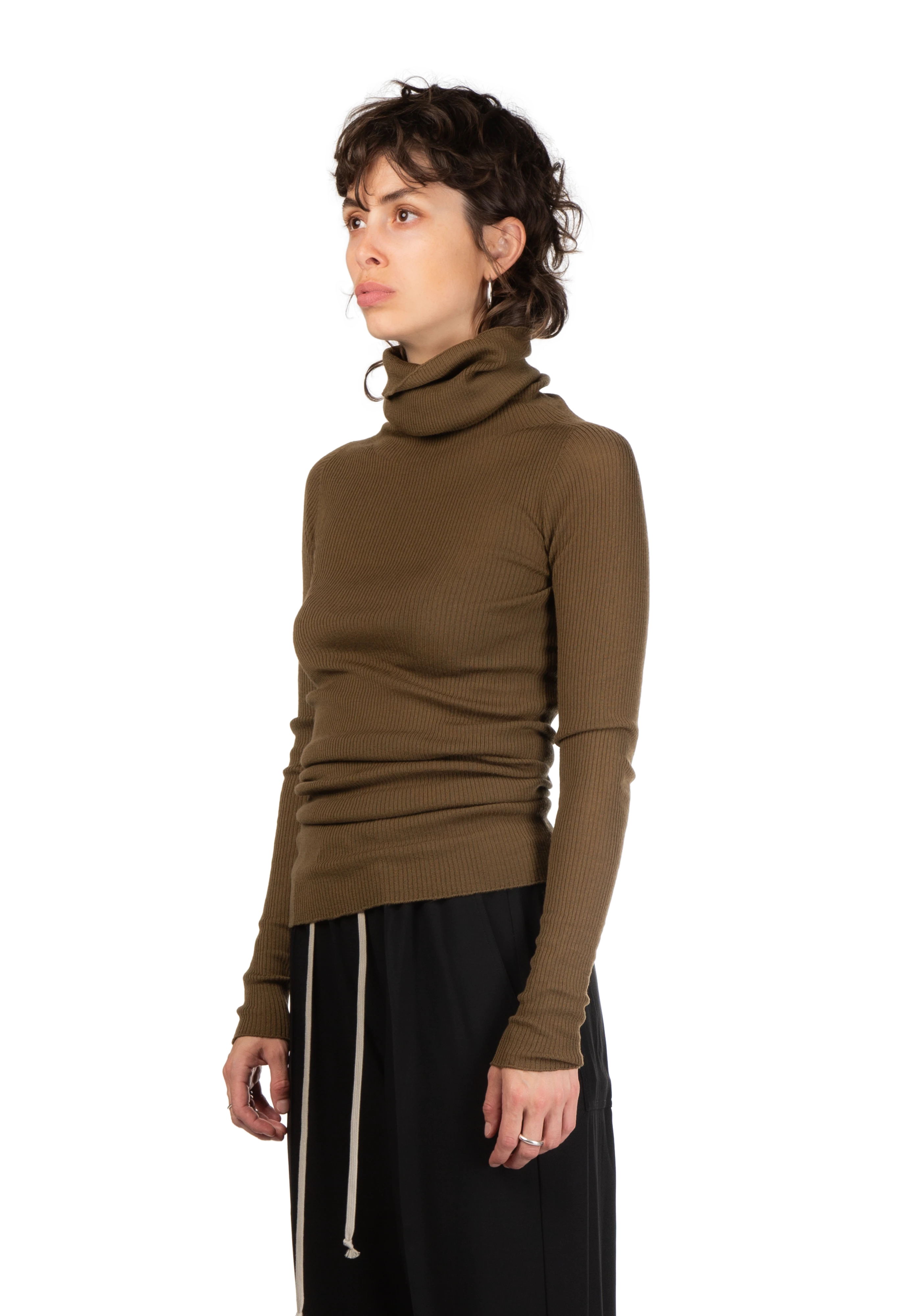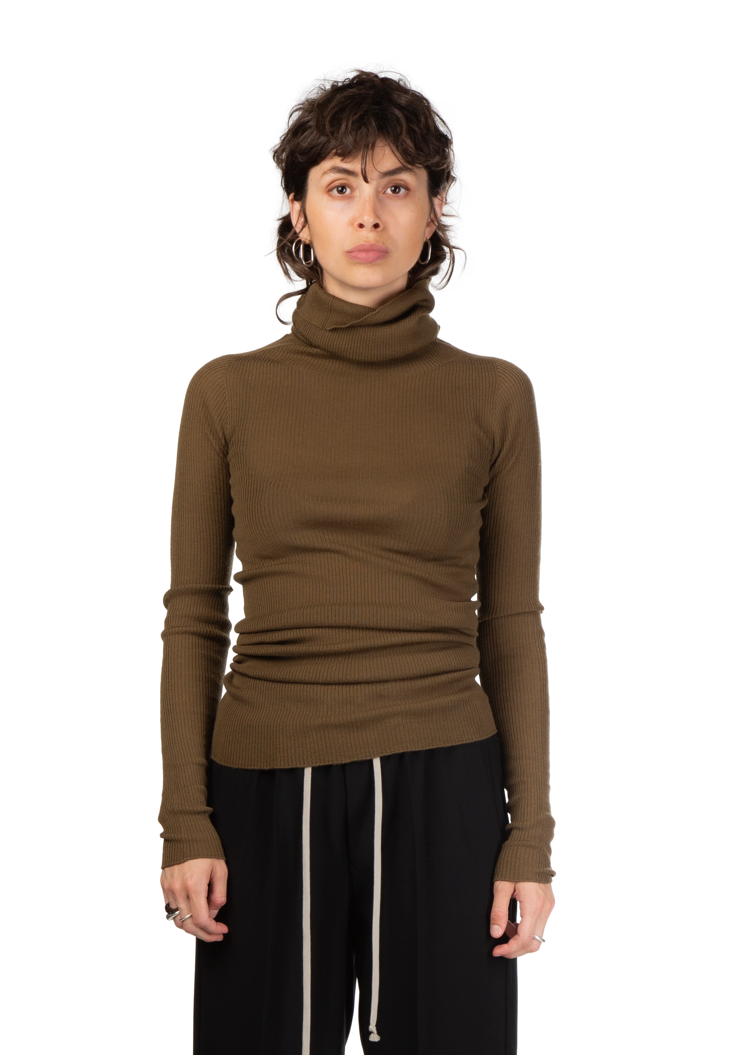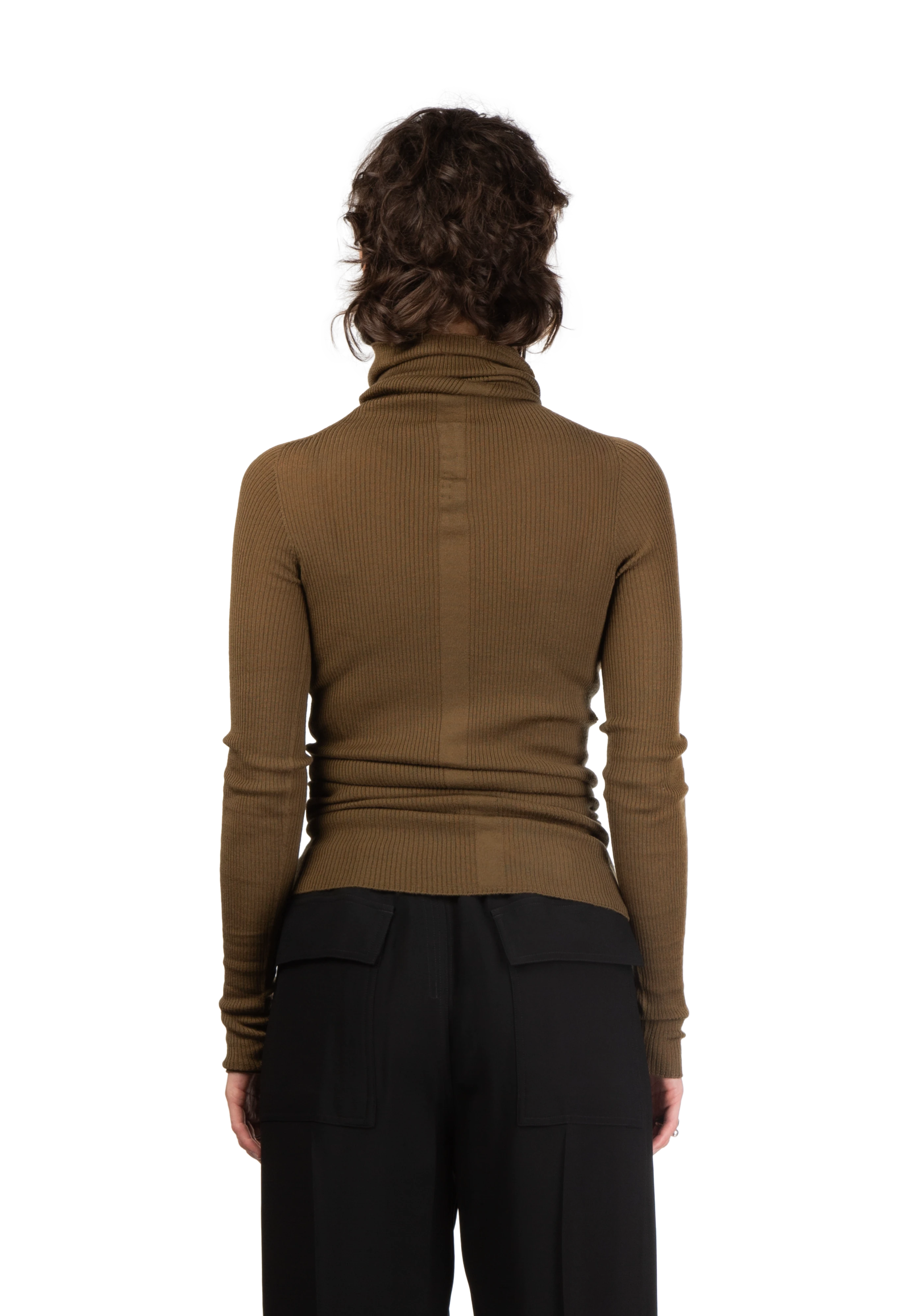 Long-sleeve viscose & silk jersey rib turleneck T-shirt in brown.