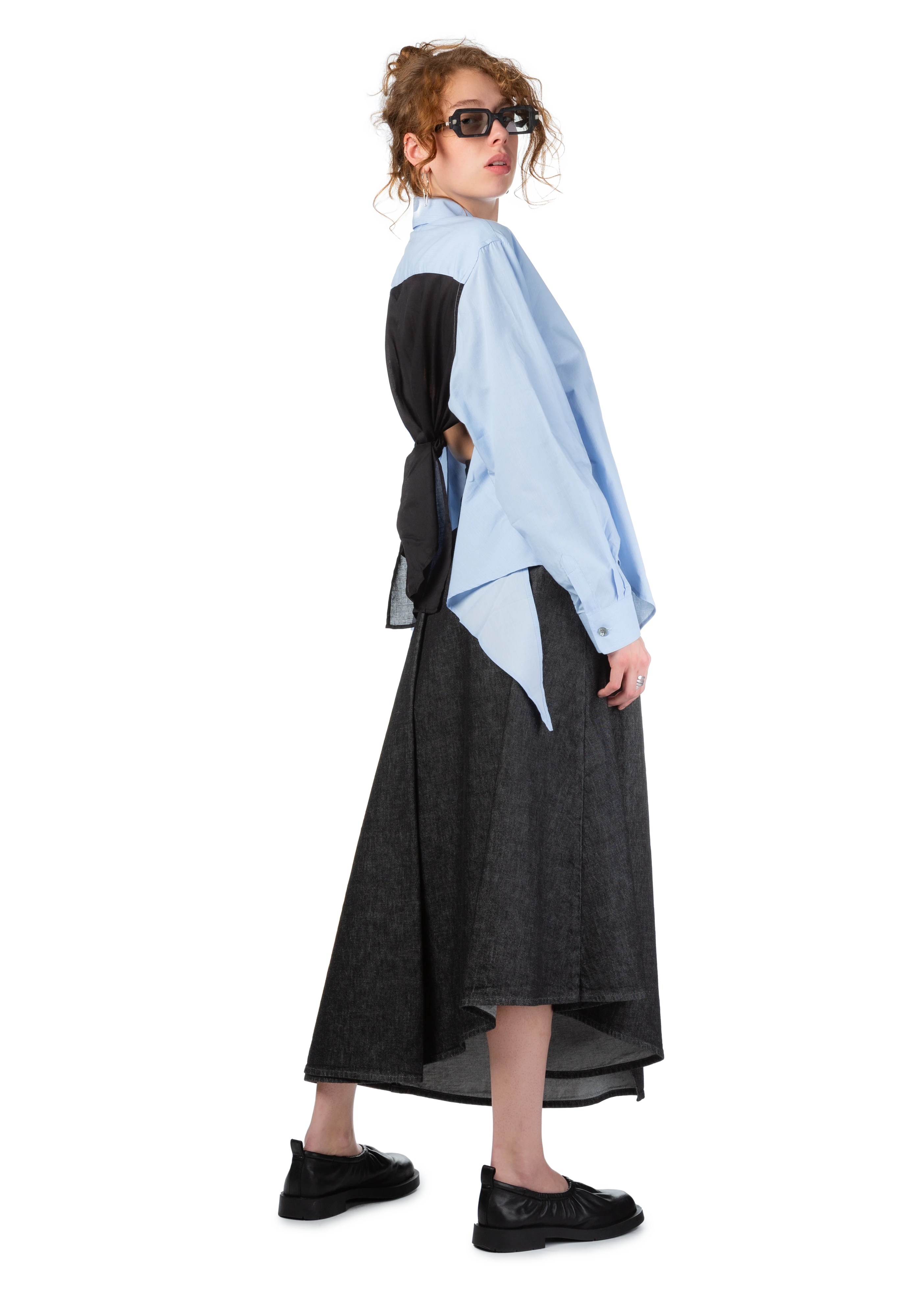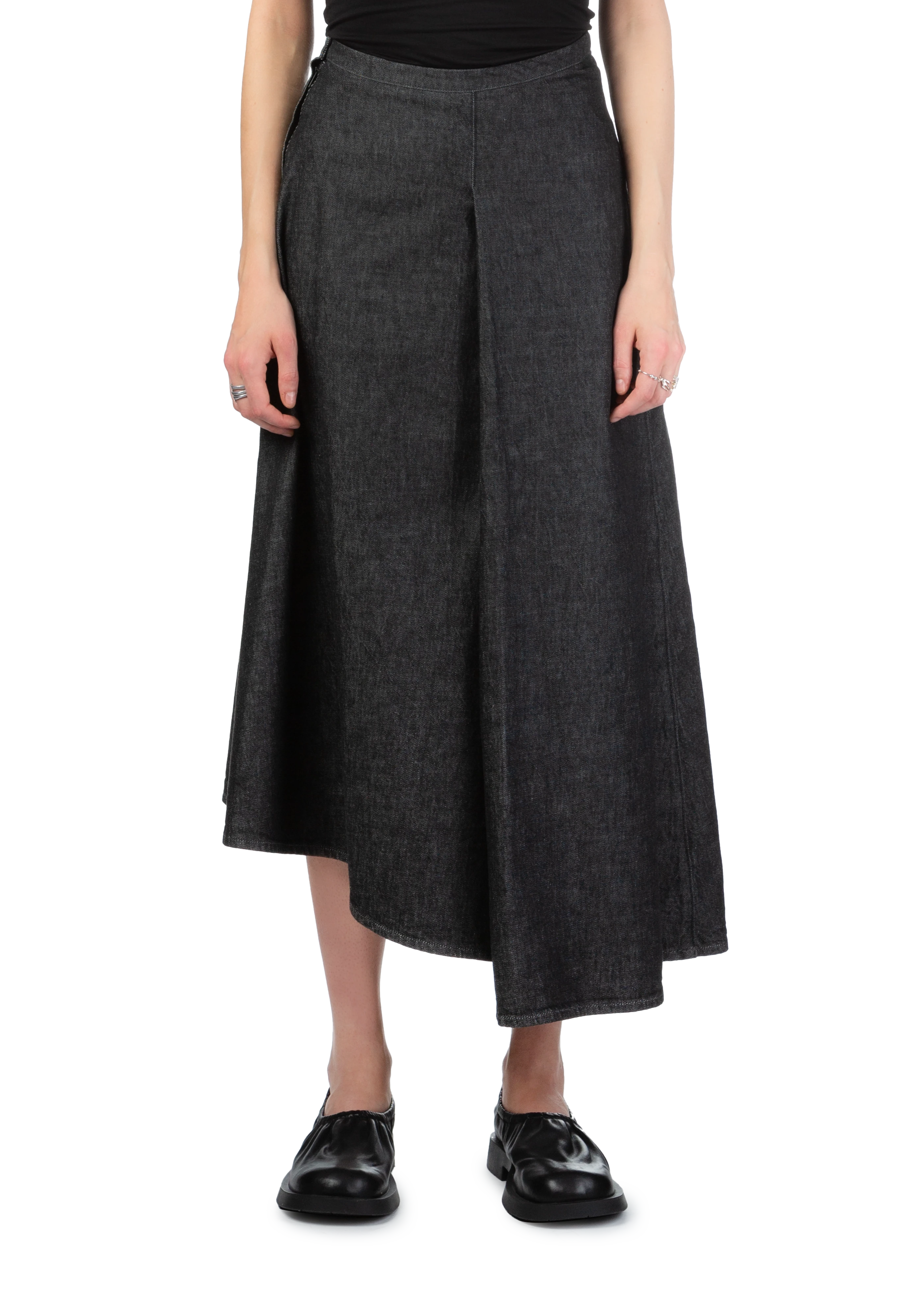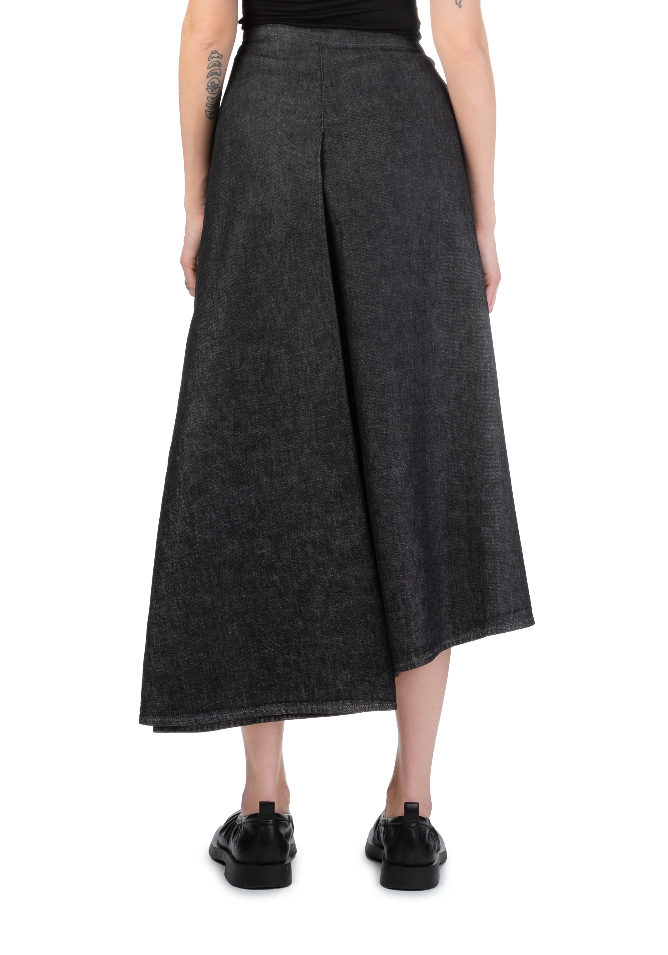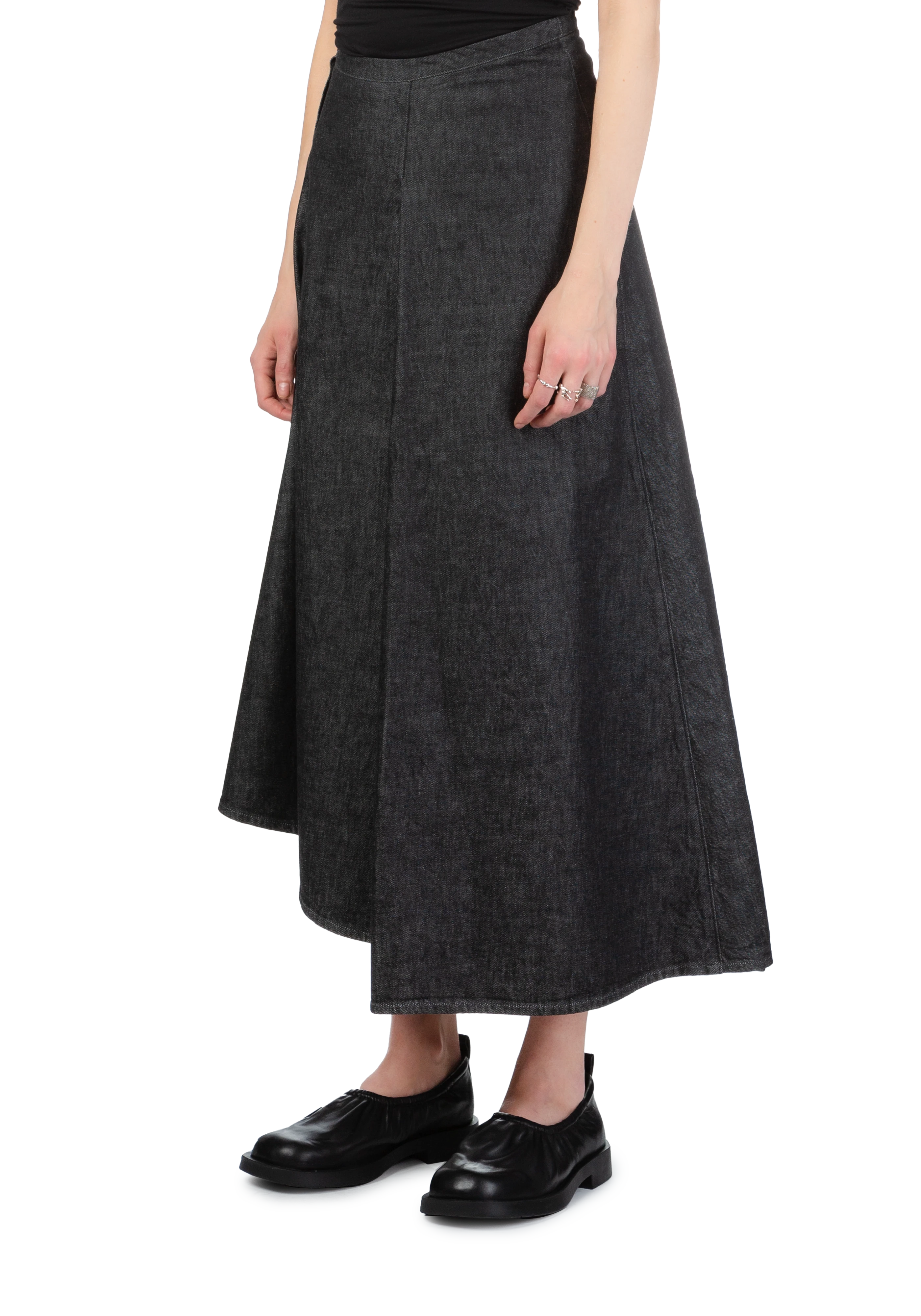 Curved midi denim skirt in black.