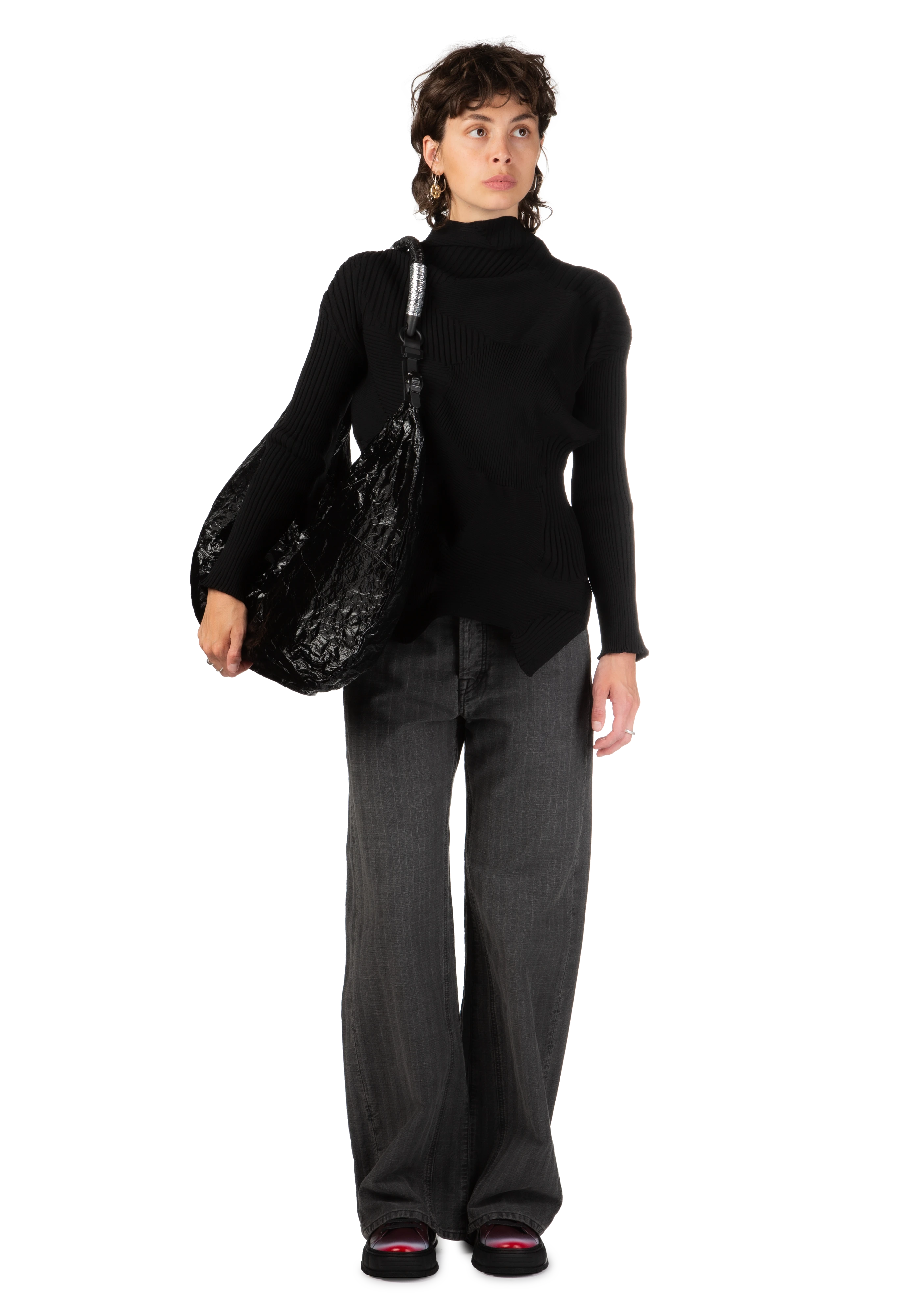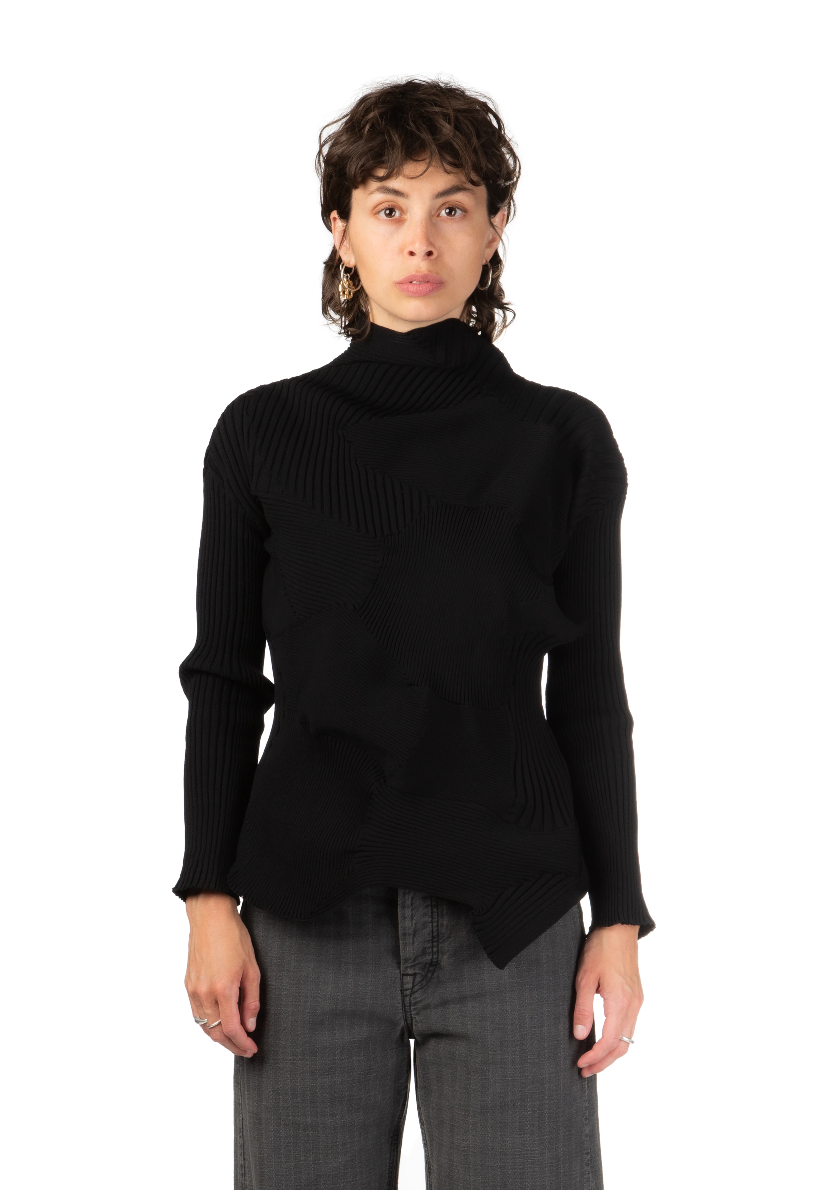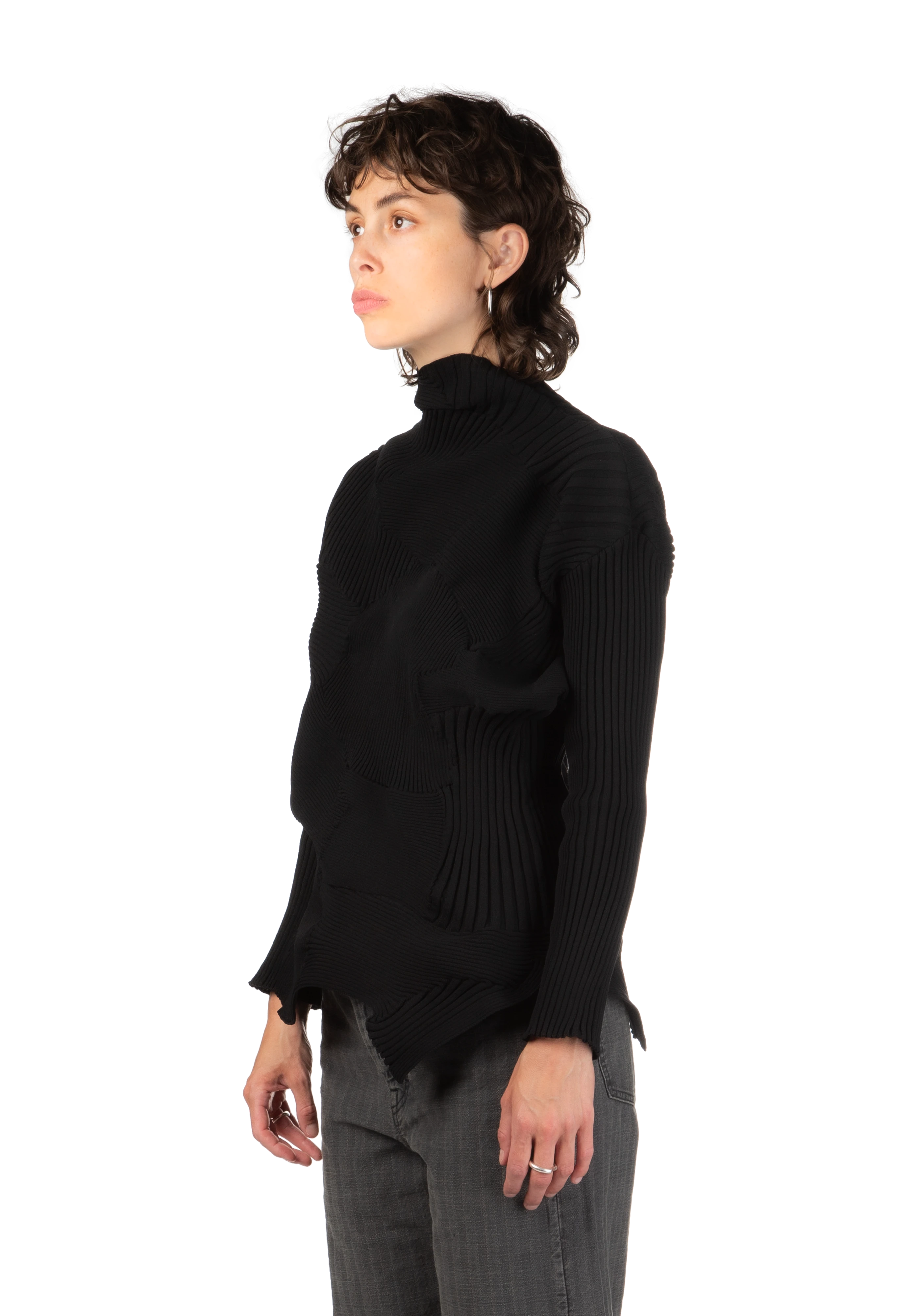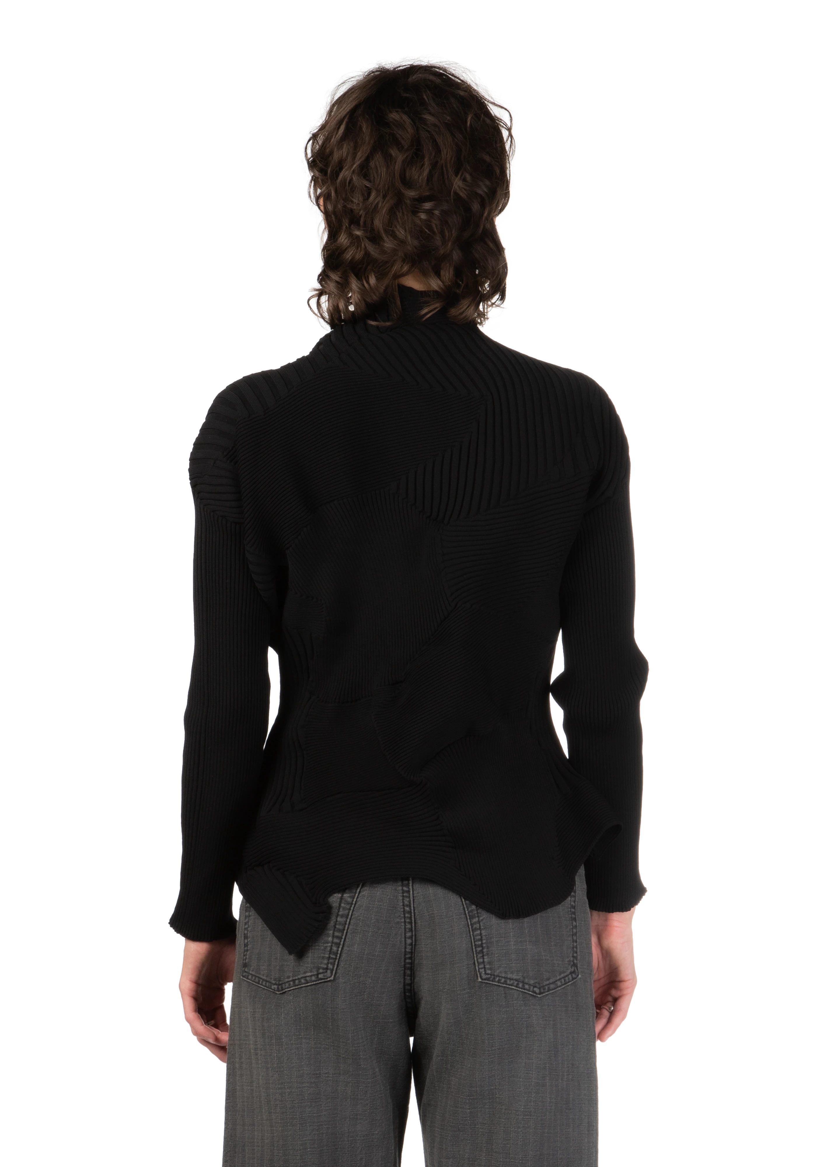 Long-sleeve sculptural rib knit sweater in black.