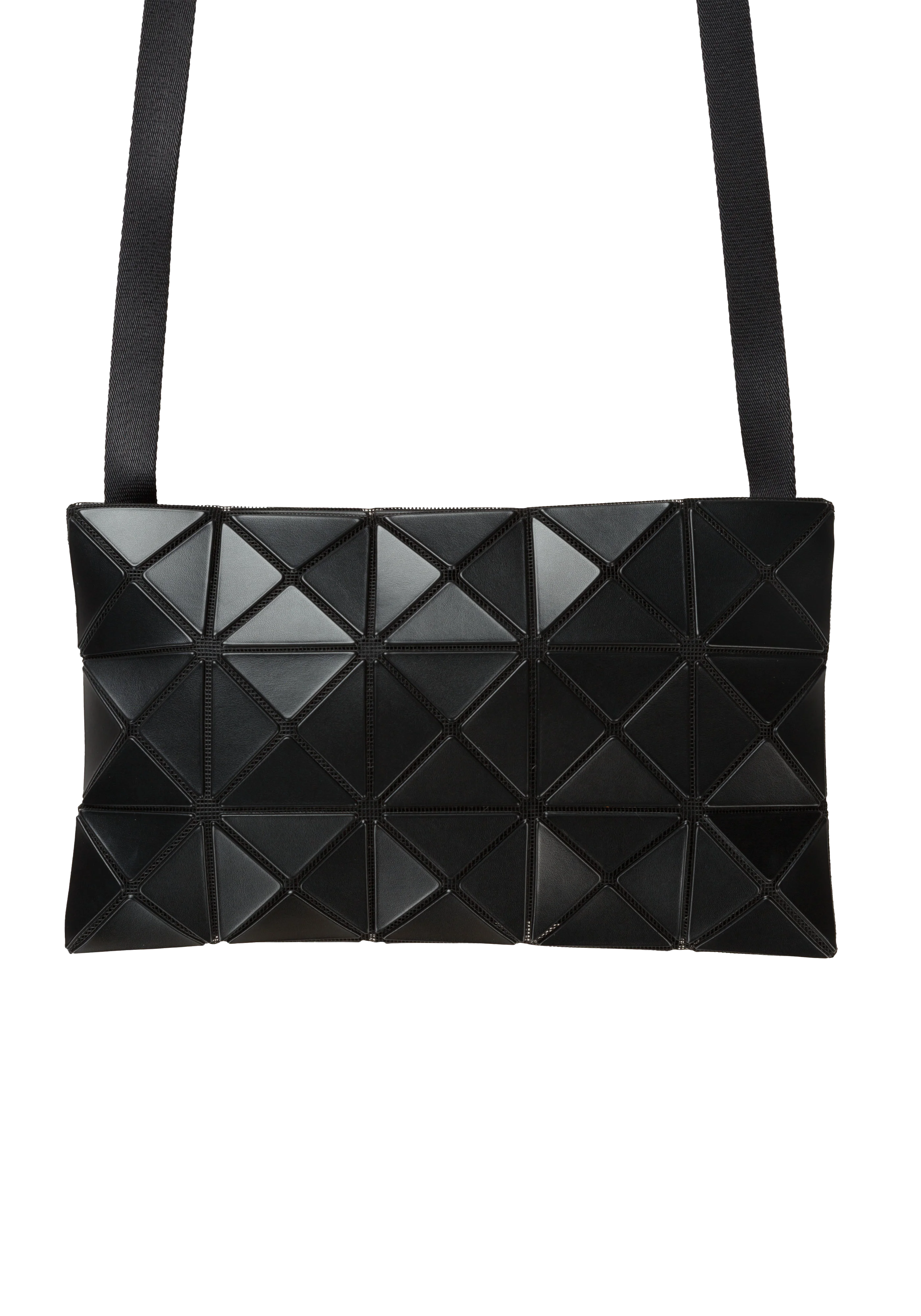 Mesh crossbody with triangular vinyl appliqués in matte black.