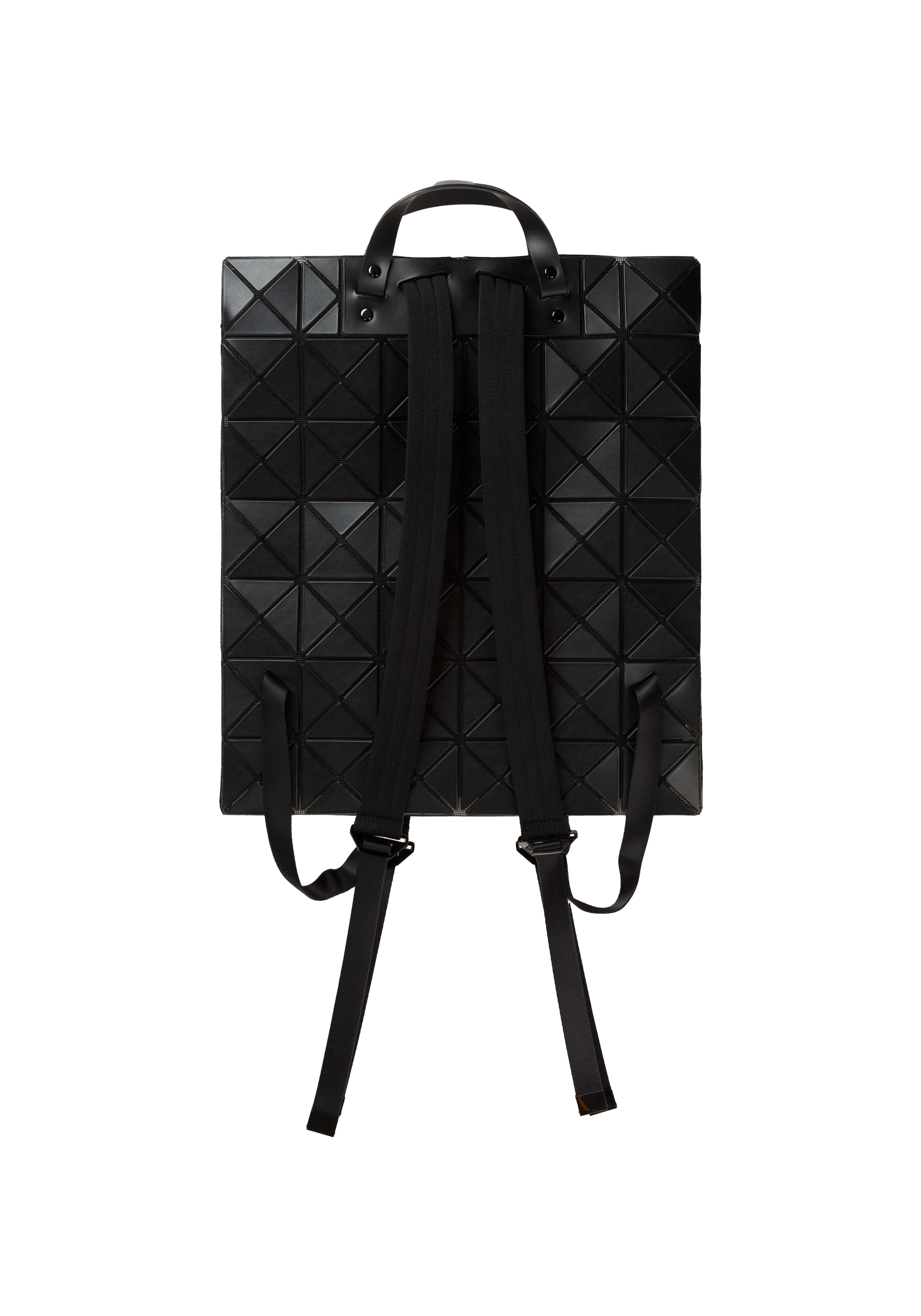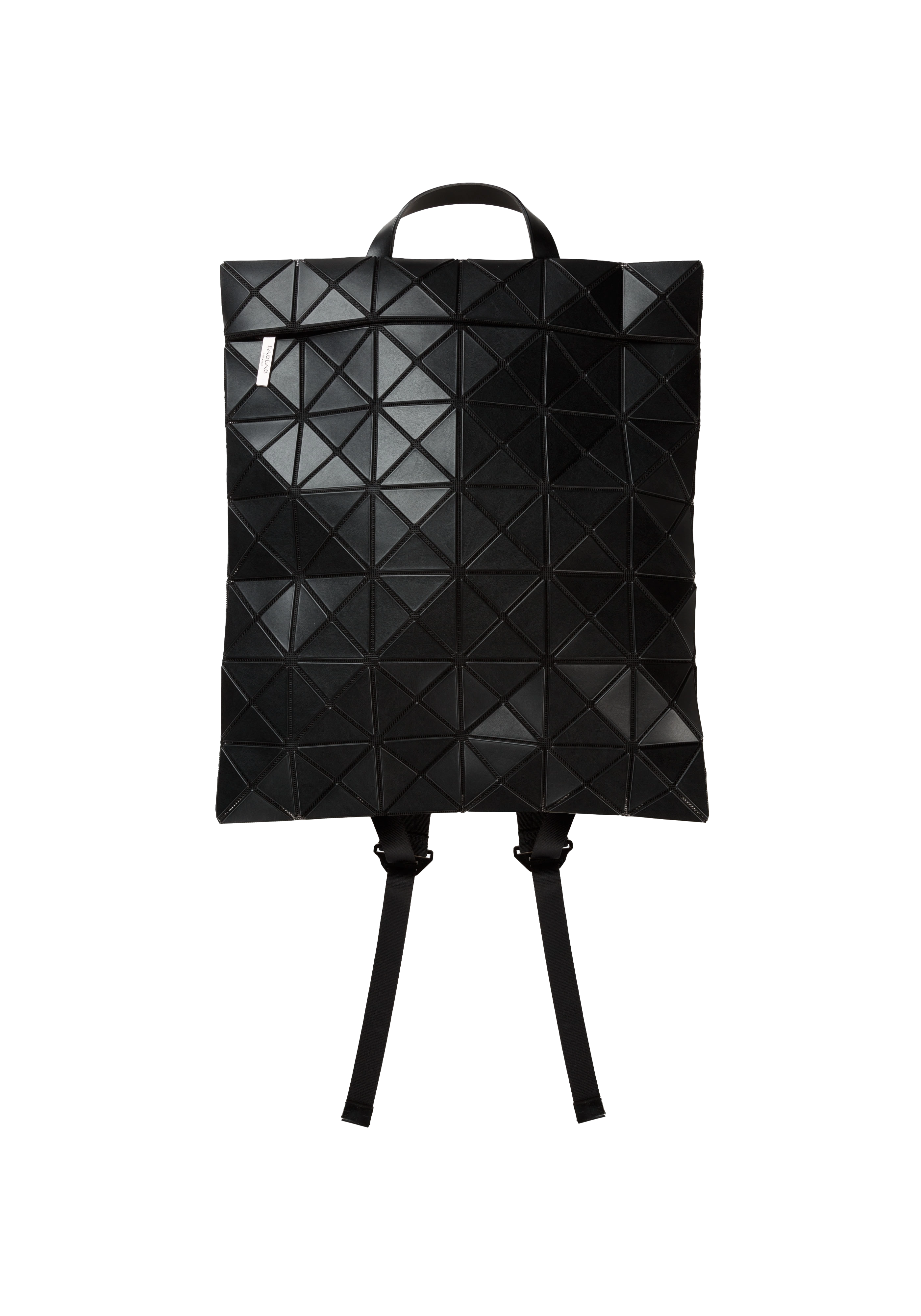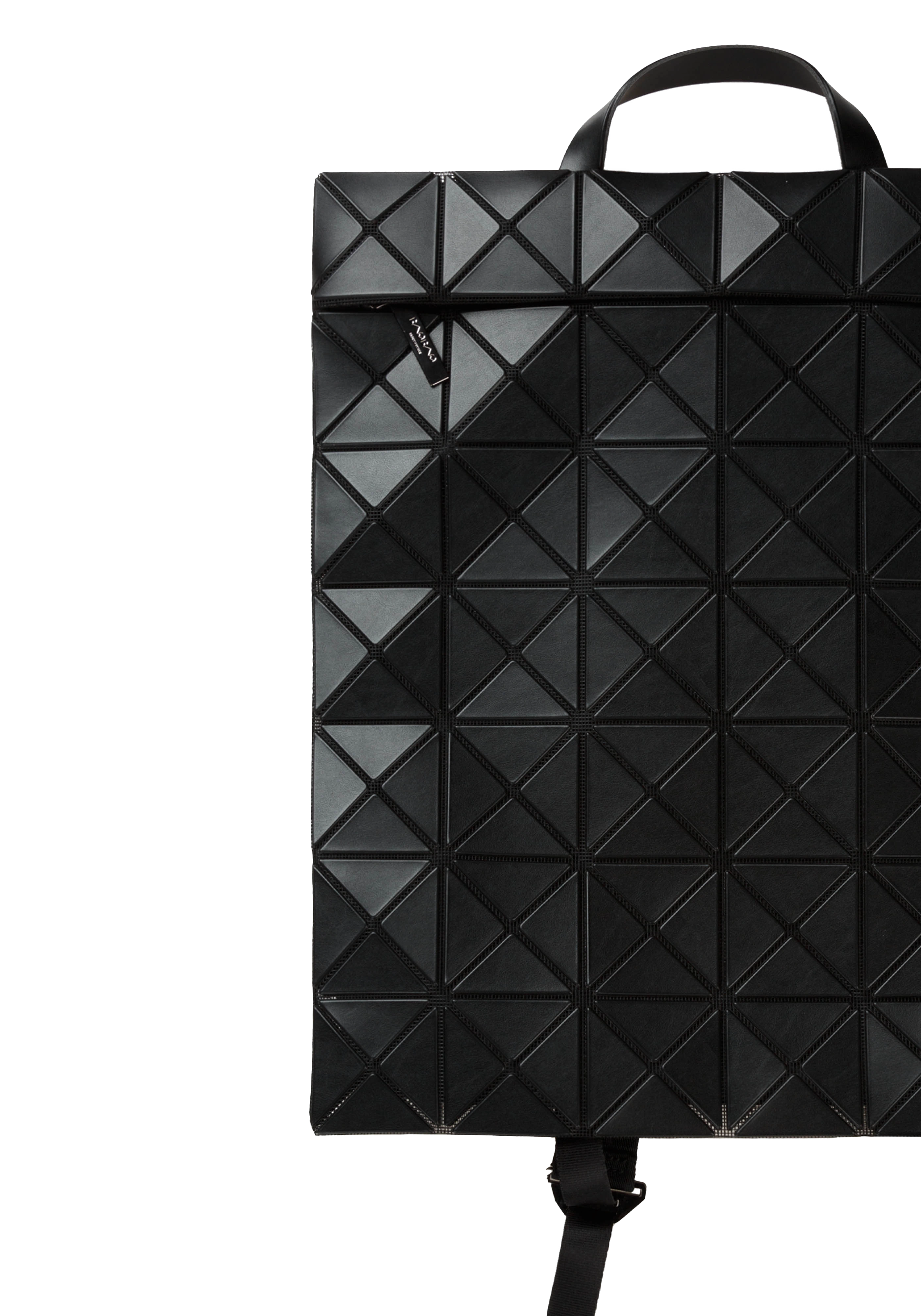 Mesh backpack with triangular vinyl appliqués in matte black.