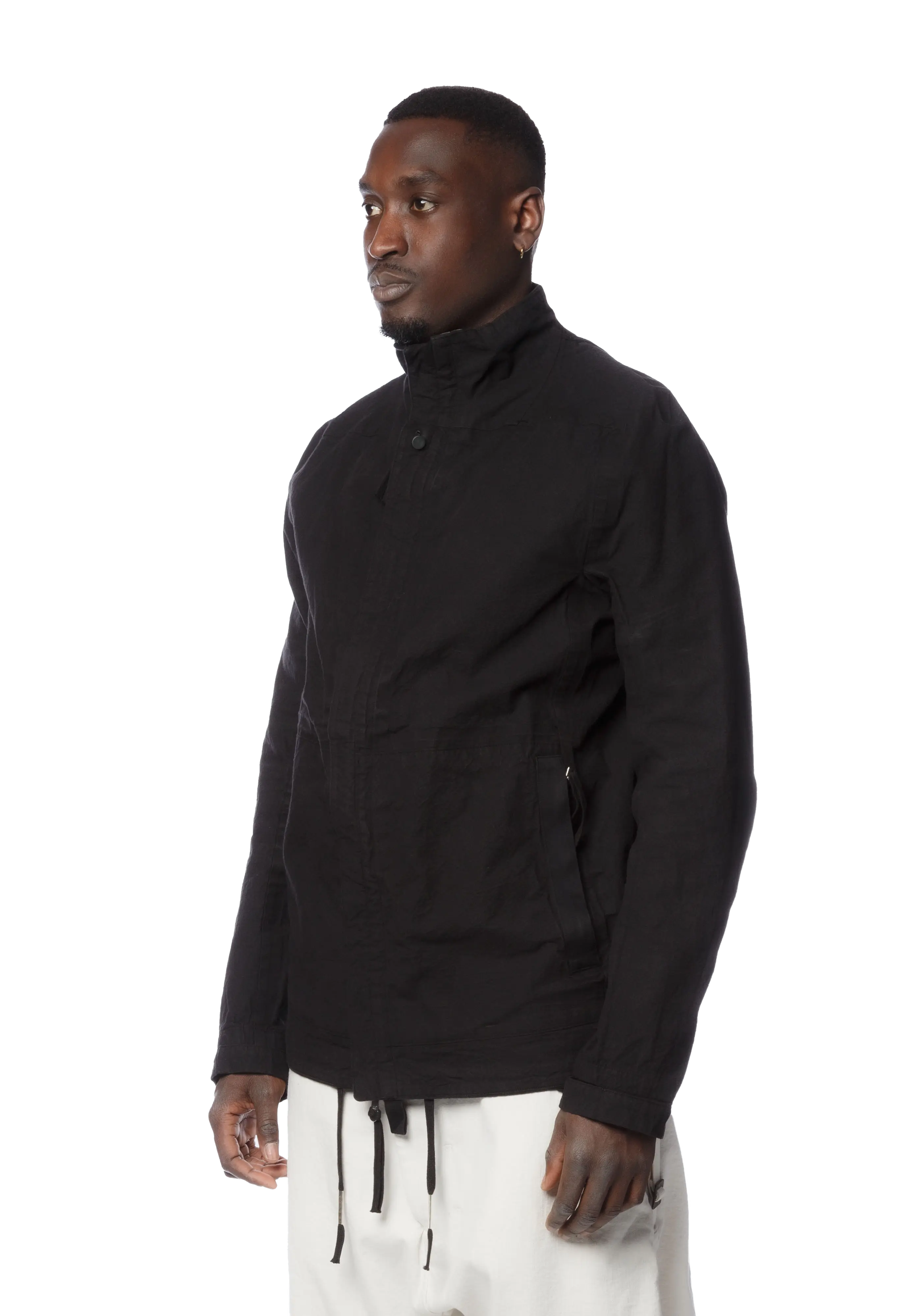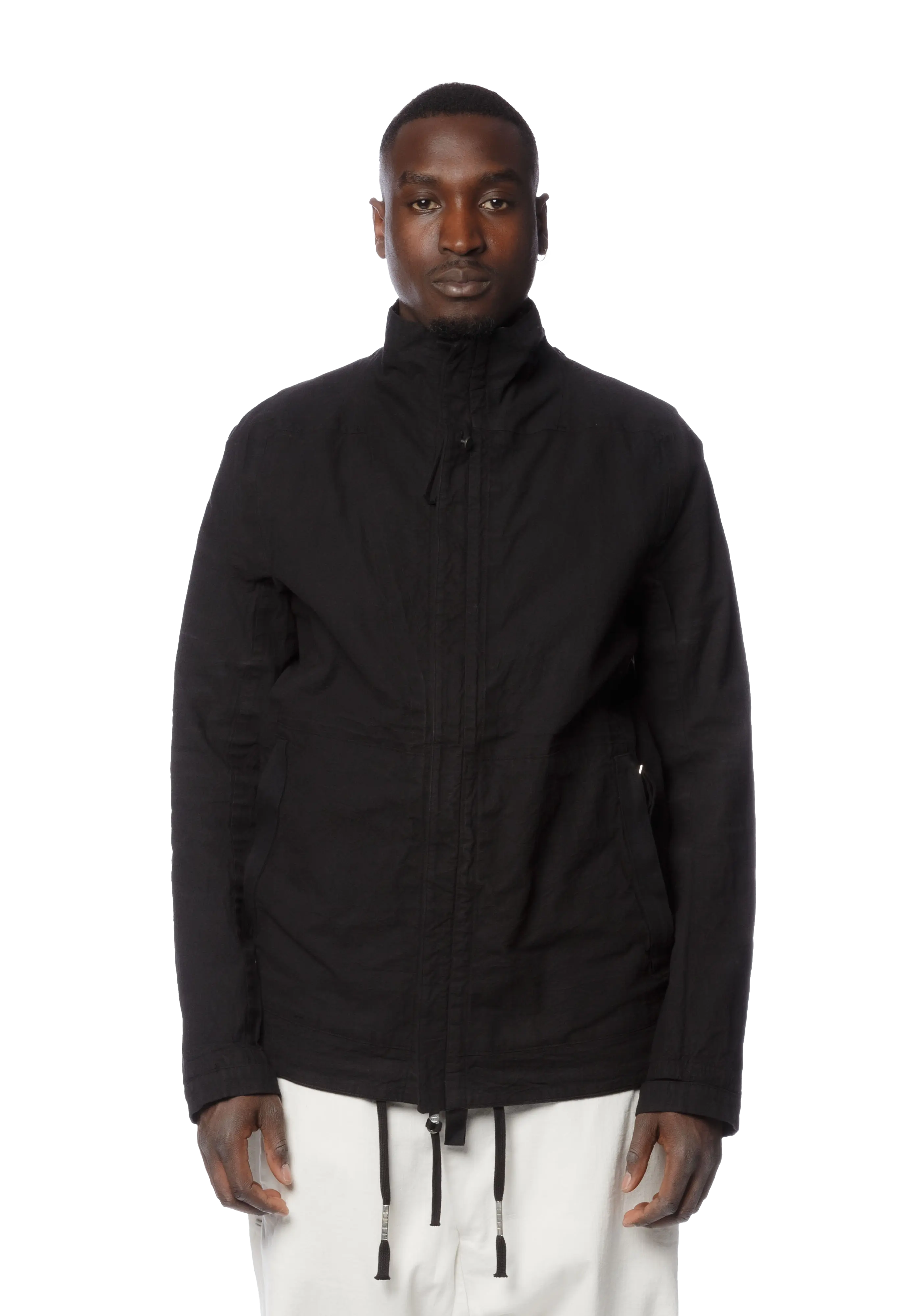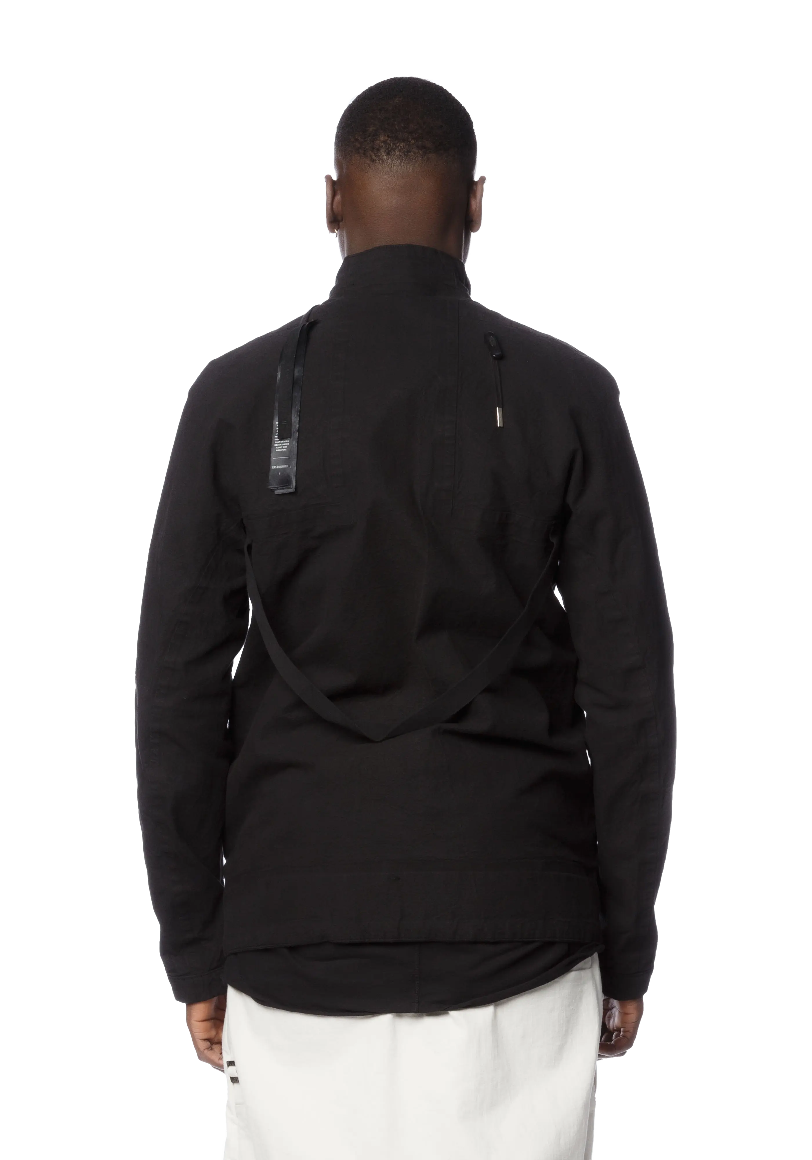 Long sleeve object-dyed waxed cotton twill jacket in black.