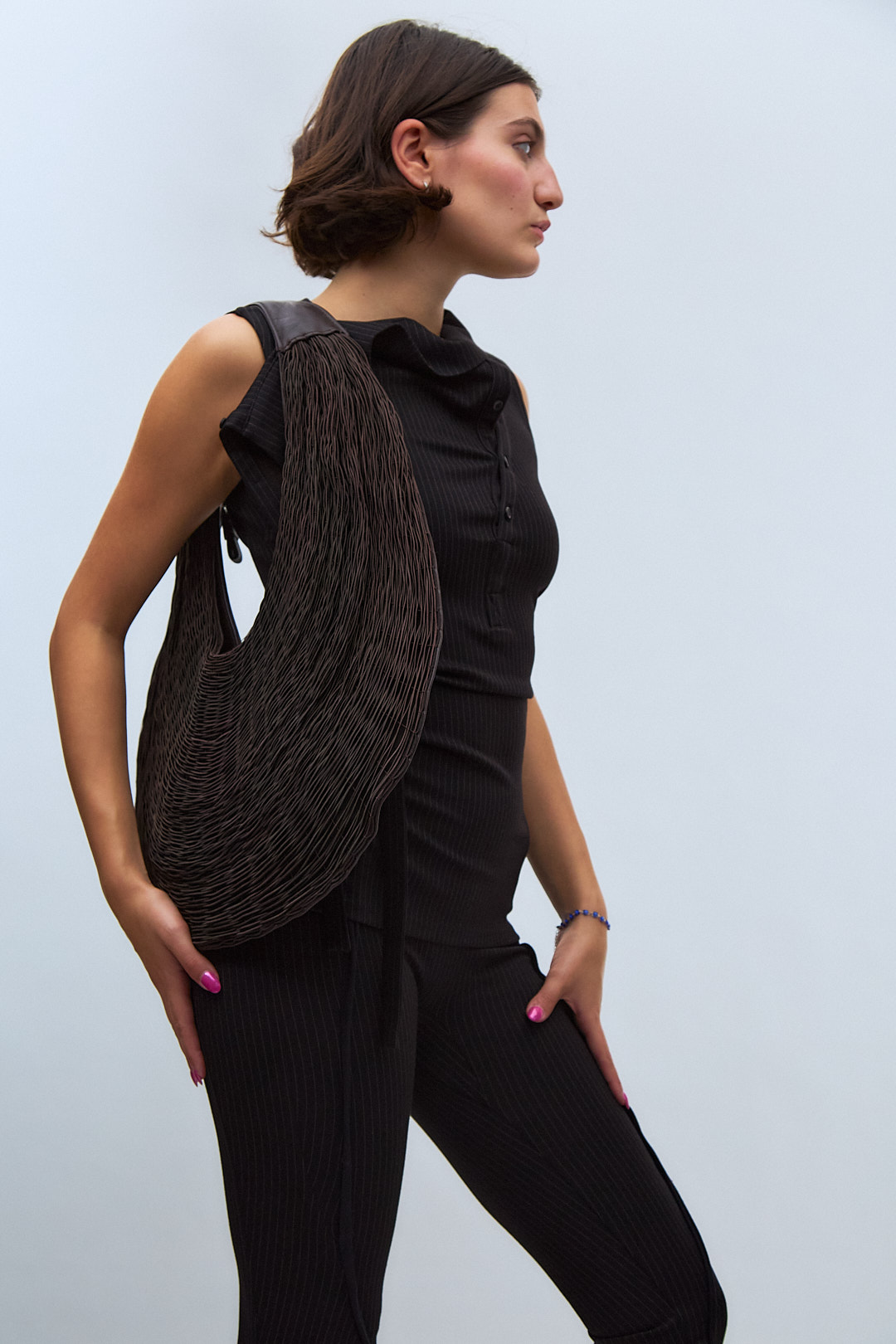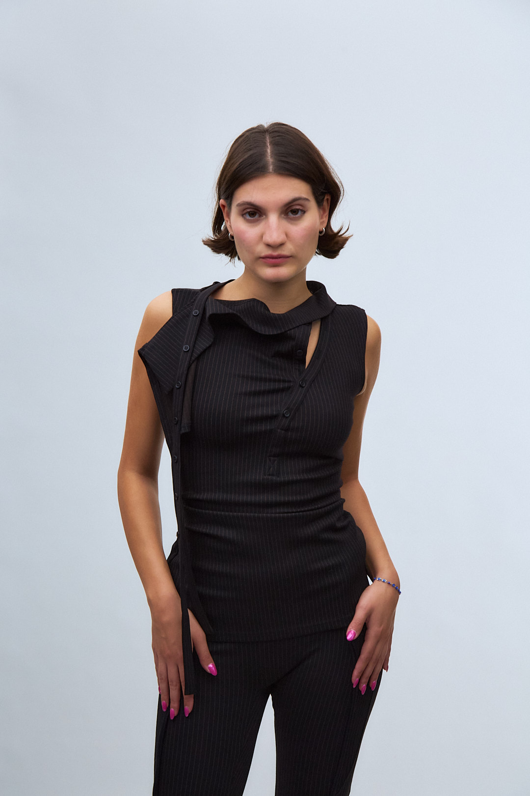 Sleeveless asymmetric stretch jersey top in black pinstripe.