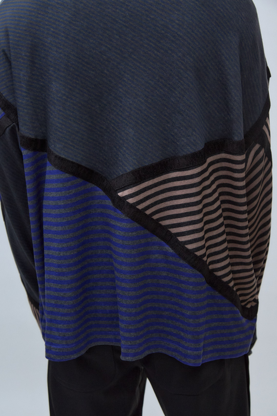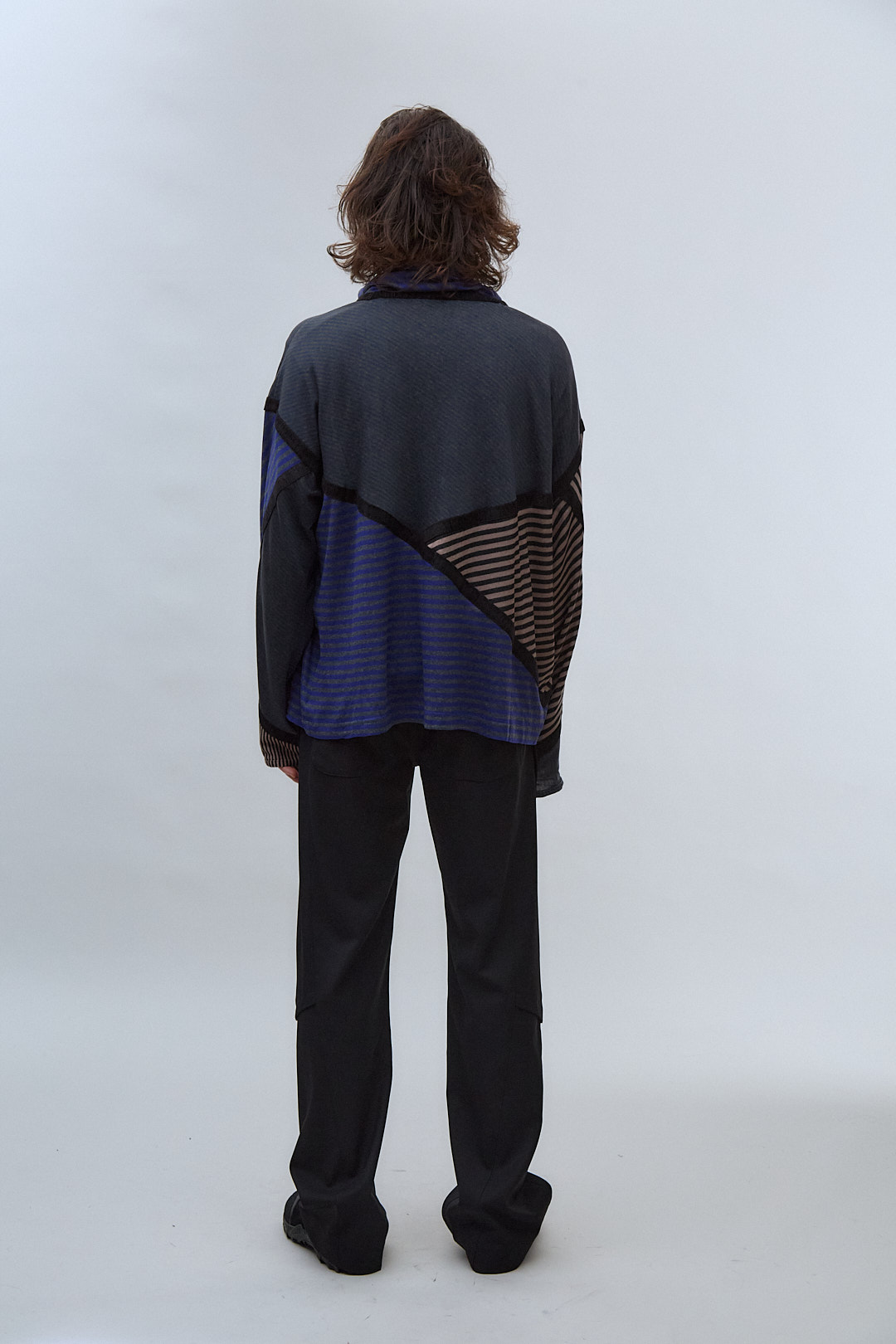 Long-sleeve relaxed jersey sweater in blue and gray.