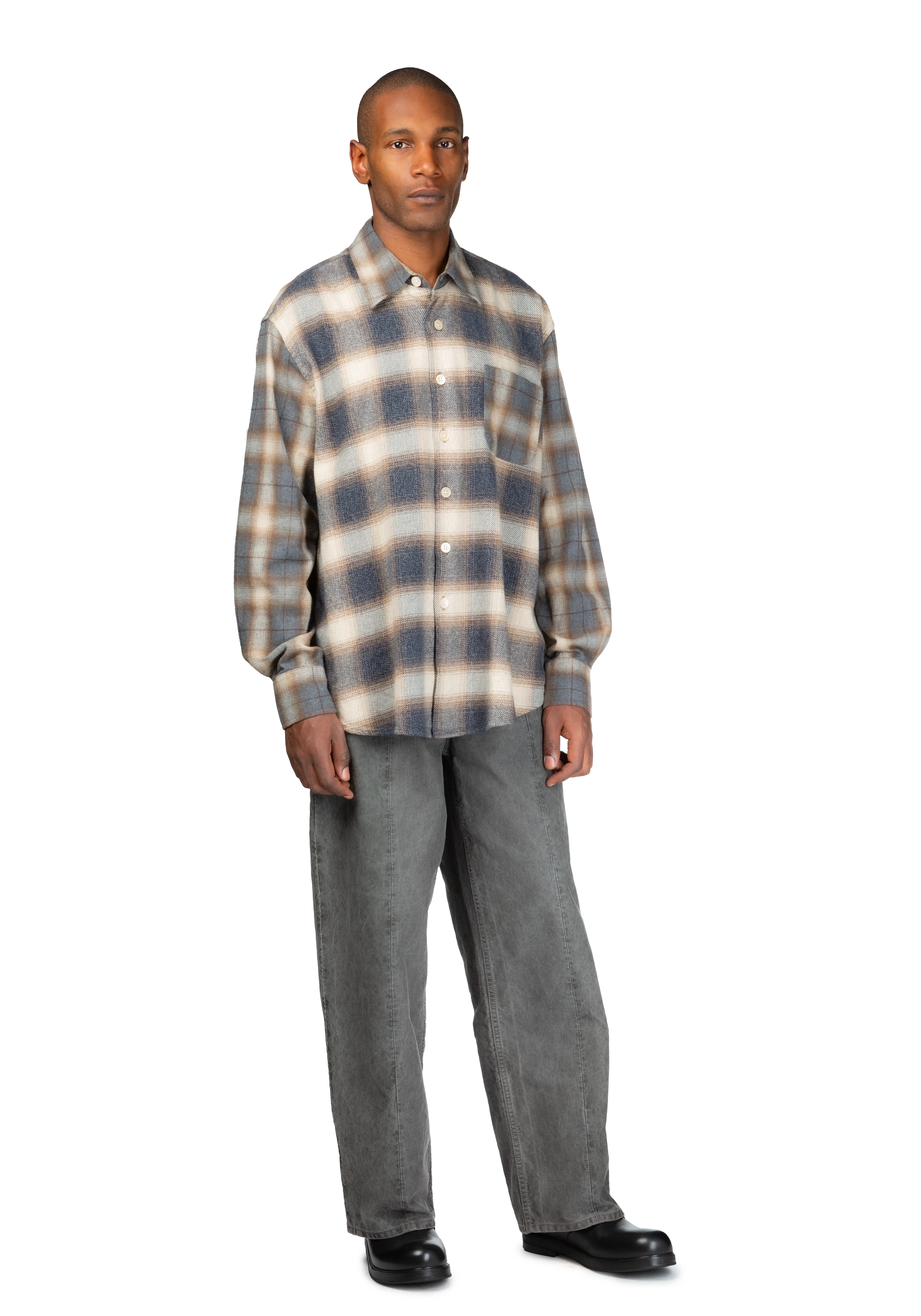 Log-sleeve oversized cotton flannel shirt in a jacquard check pattern.