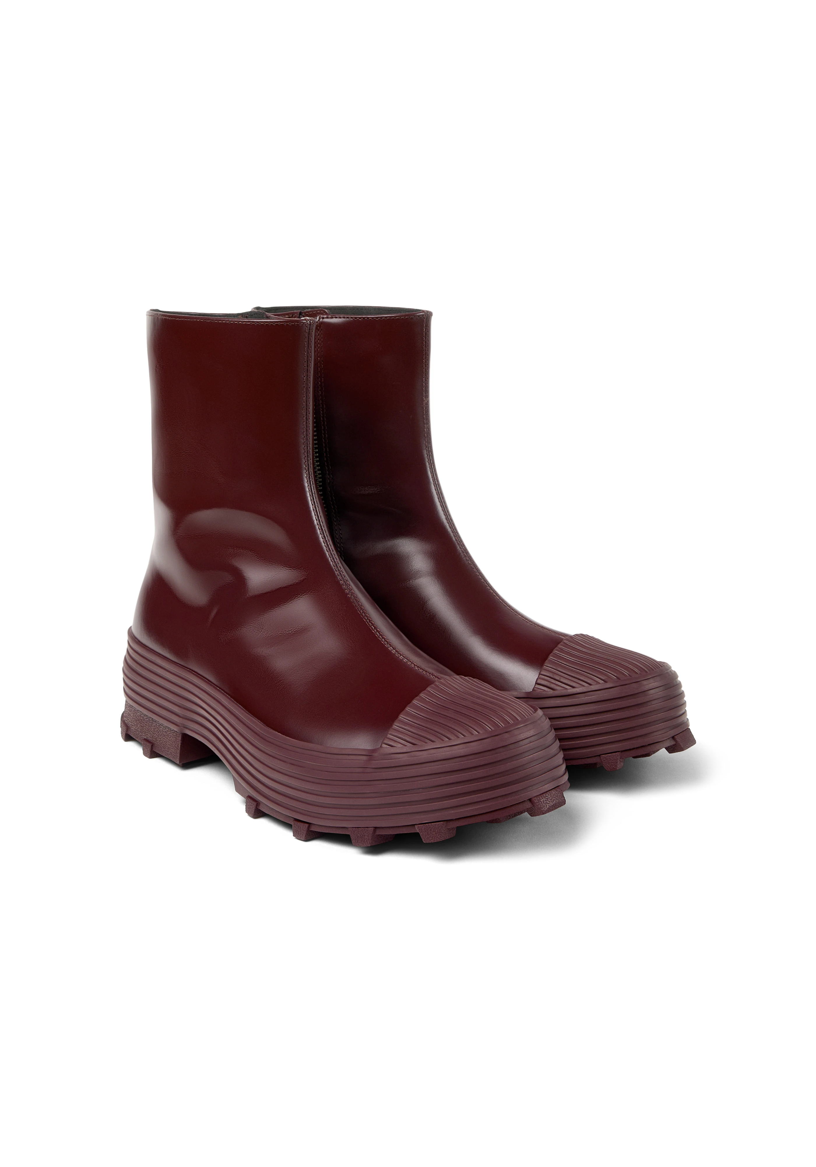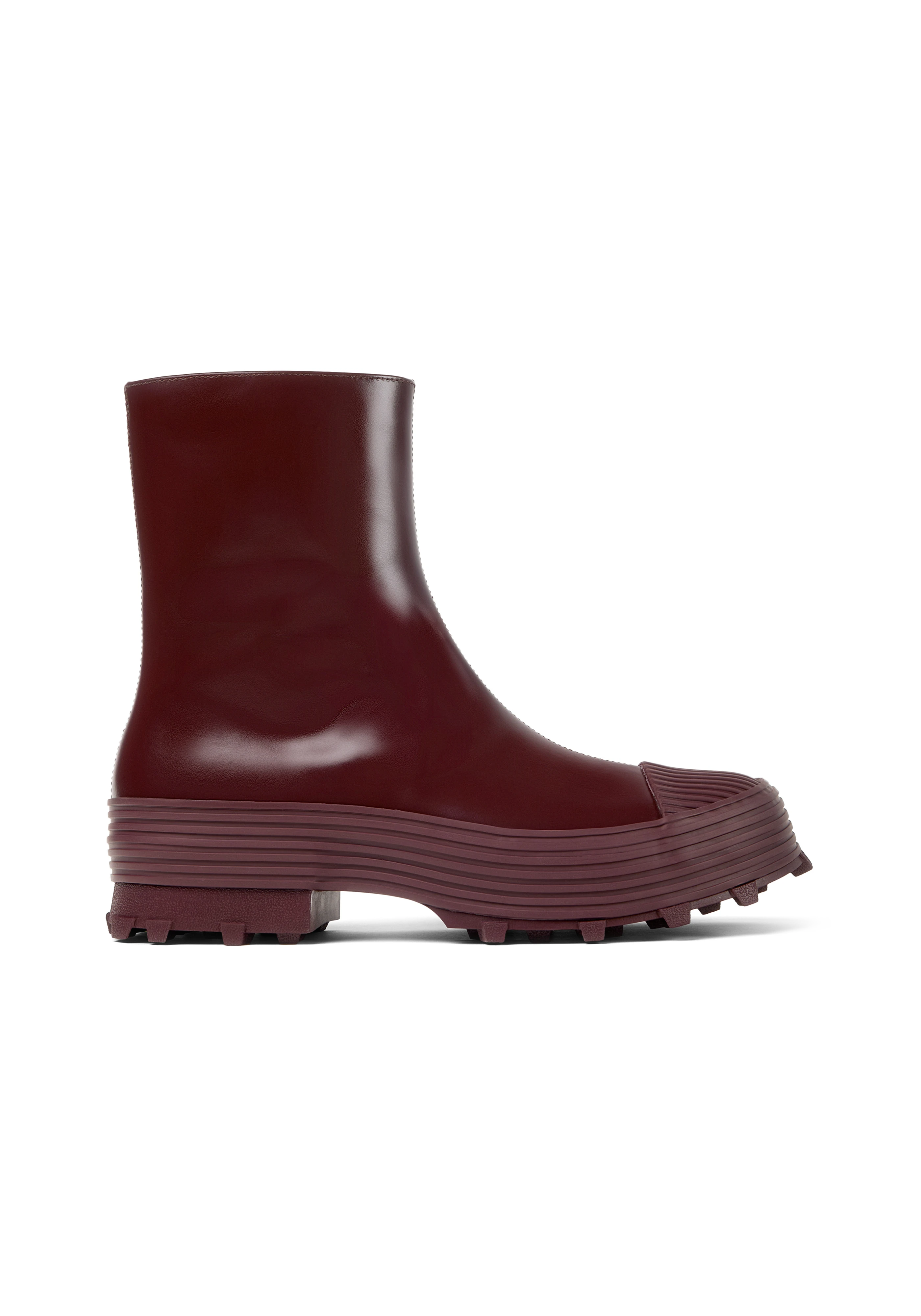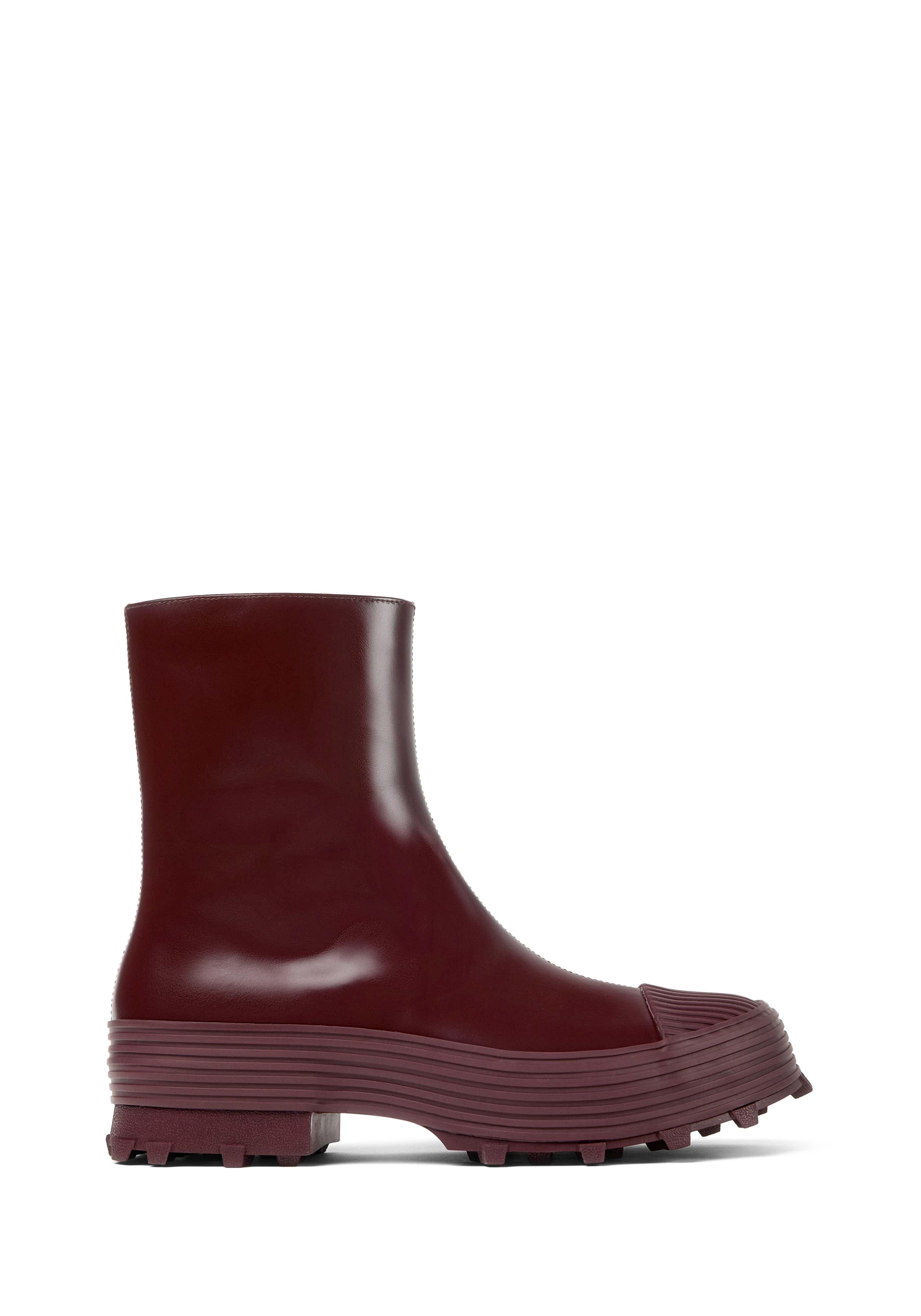 Ankle-high vulcanized buffed calfskin boots in burgundy.