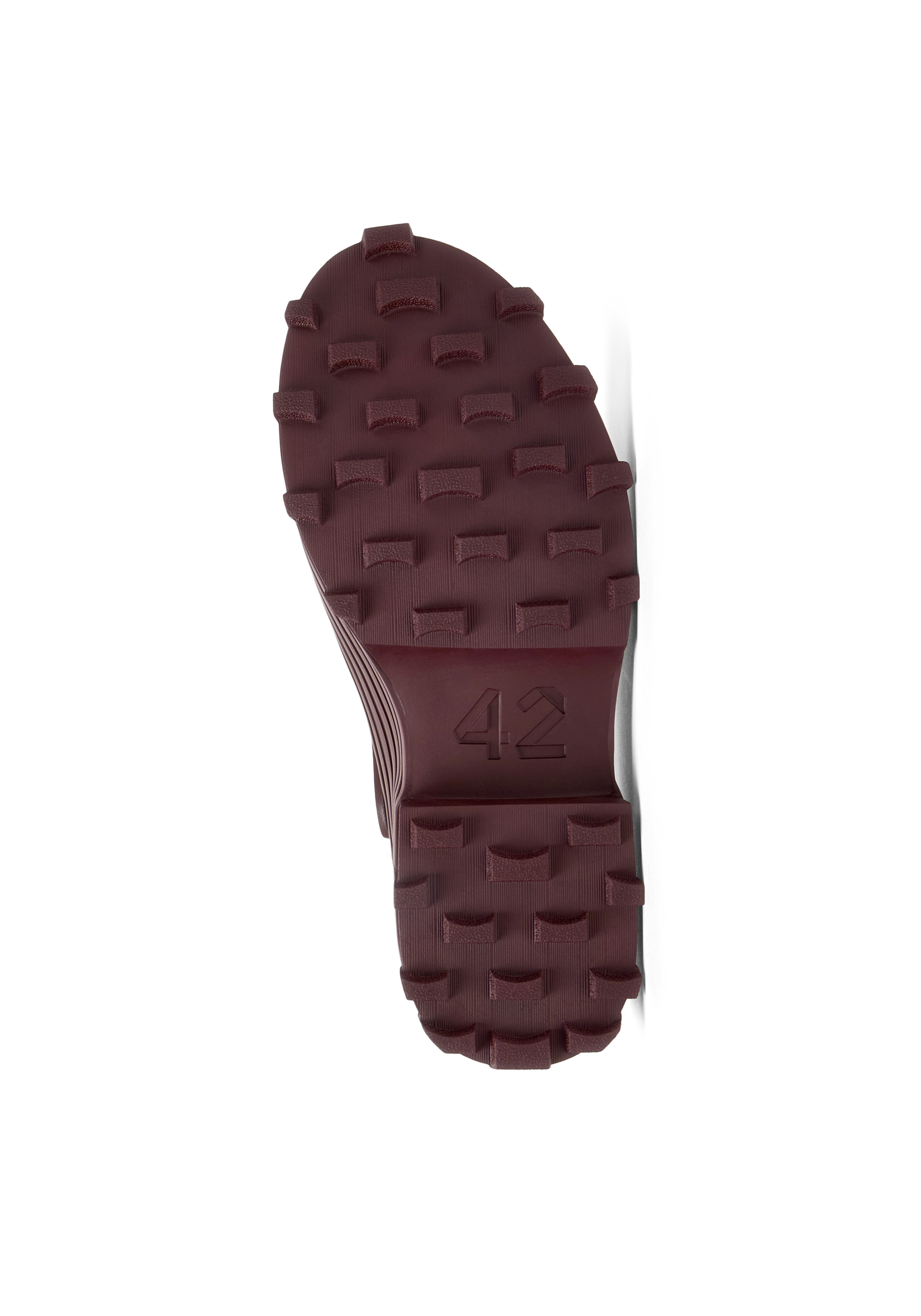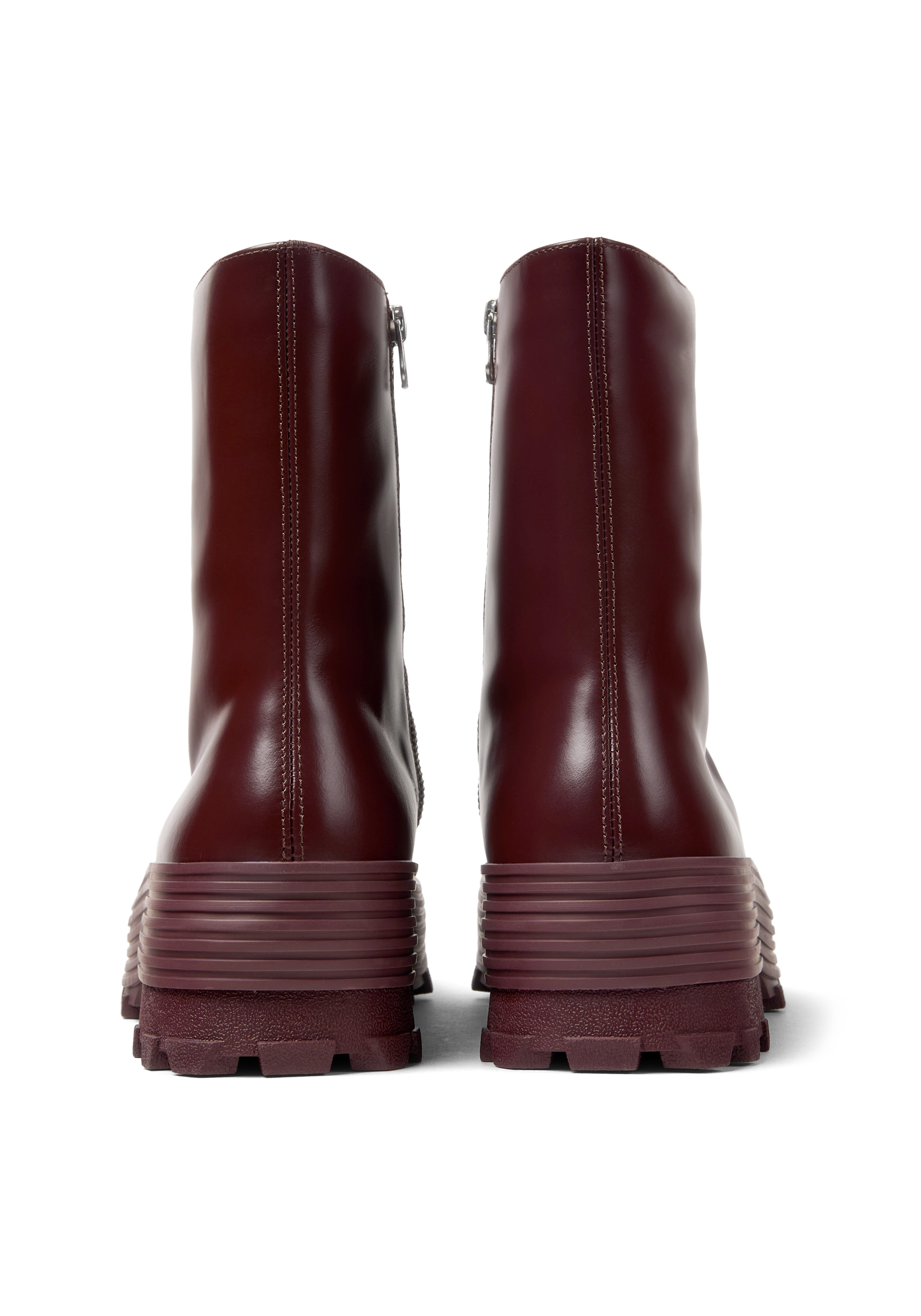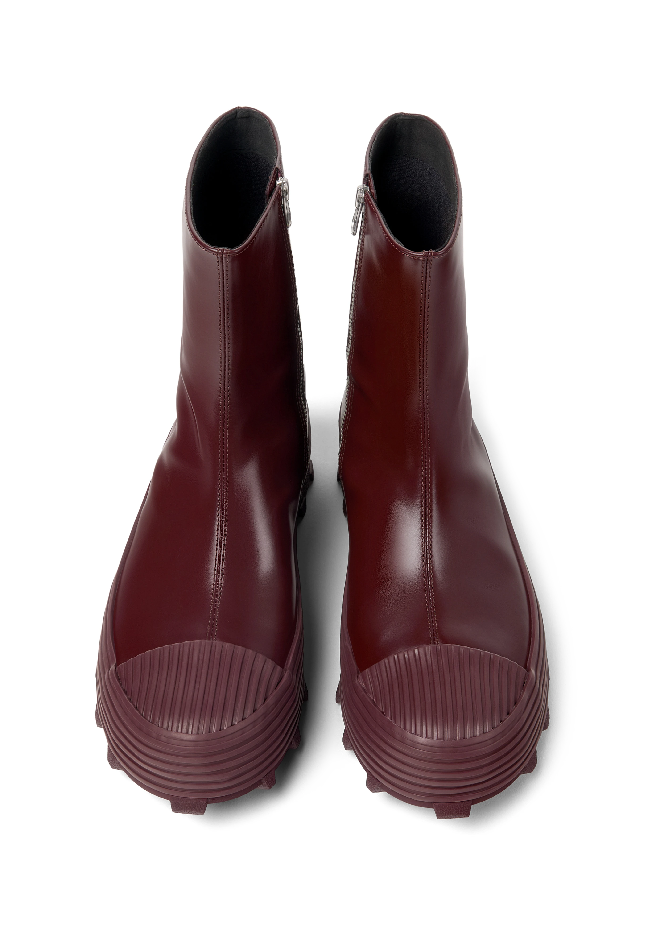 Ankle-high vulcanized buffed calfskin boots in burgundy.