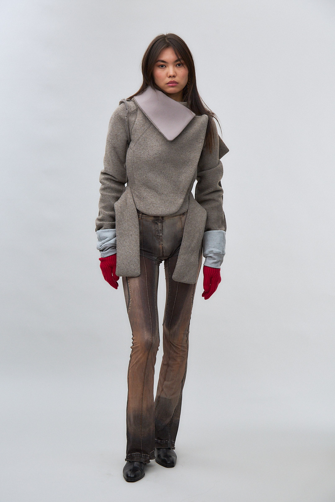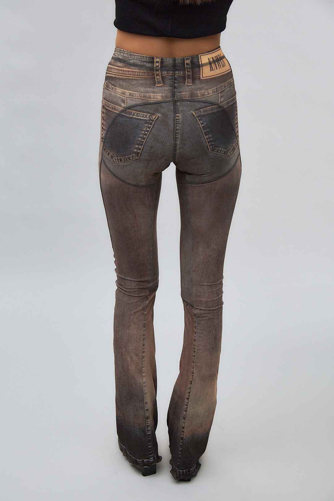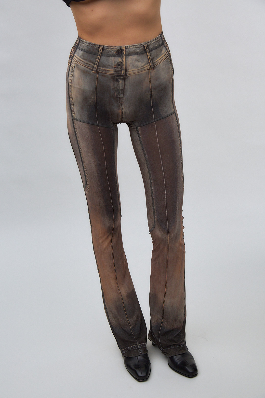 Semi-sheer flared stretch polyester jersey trousers.