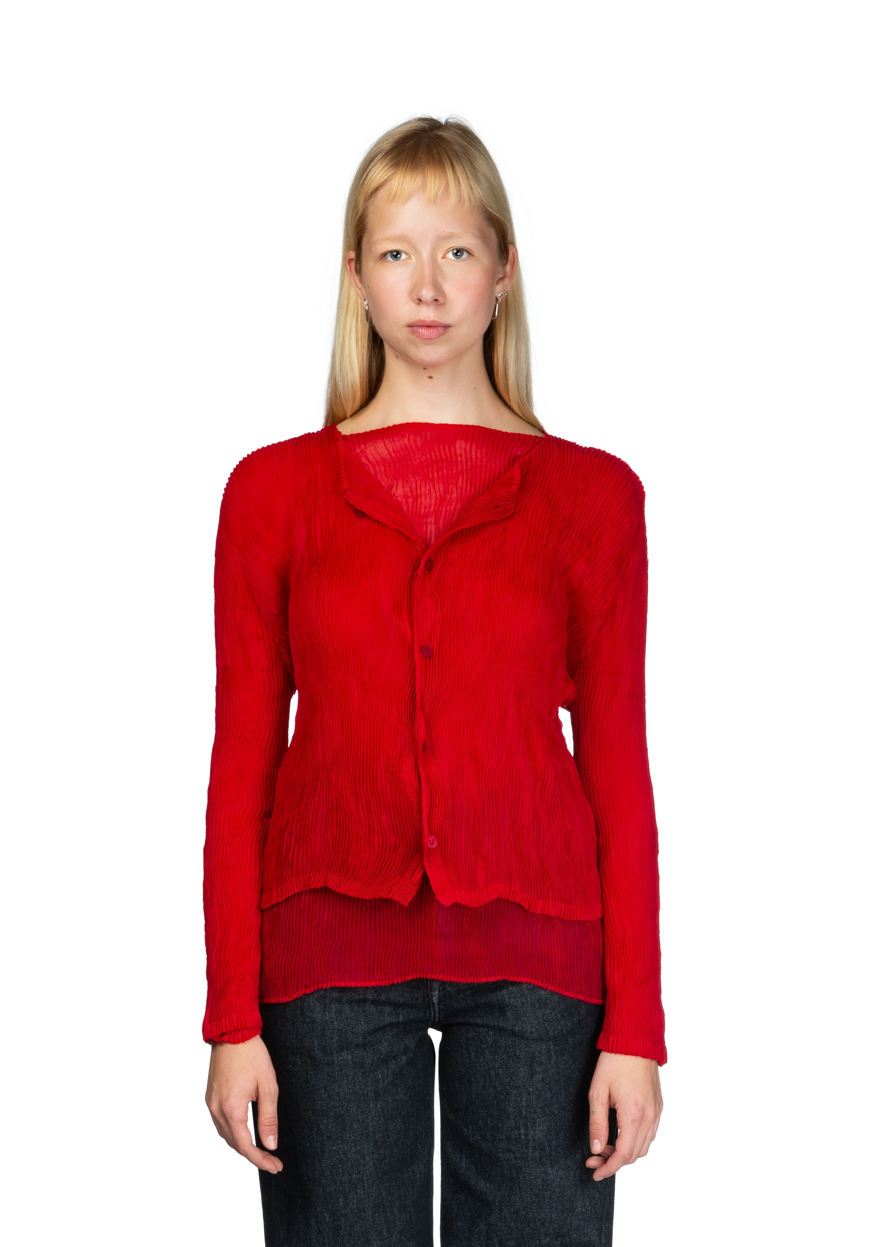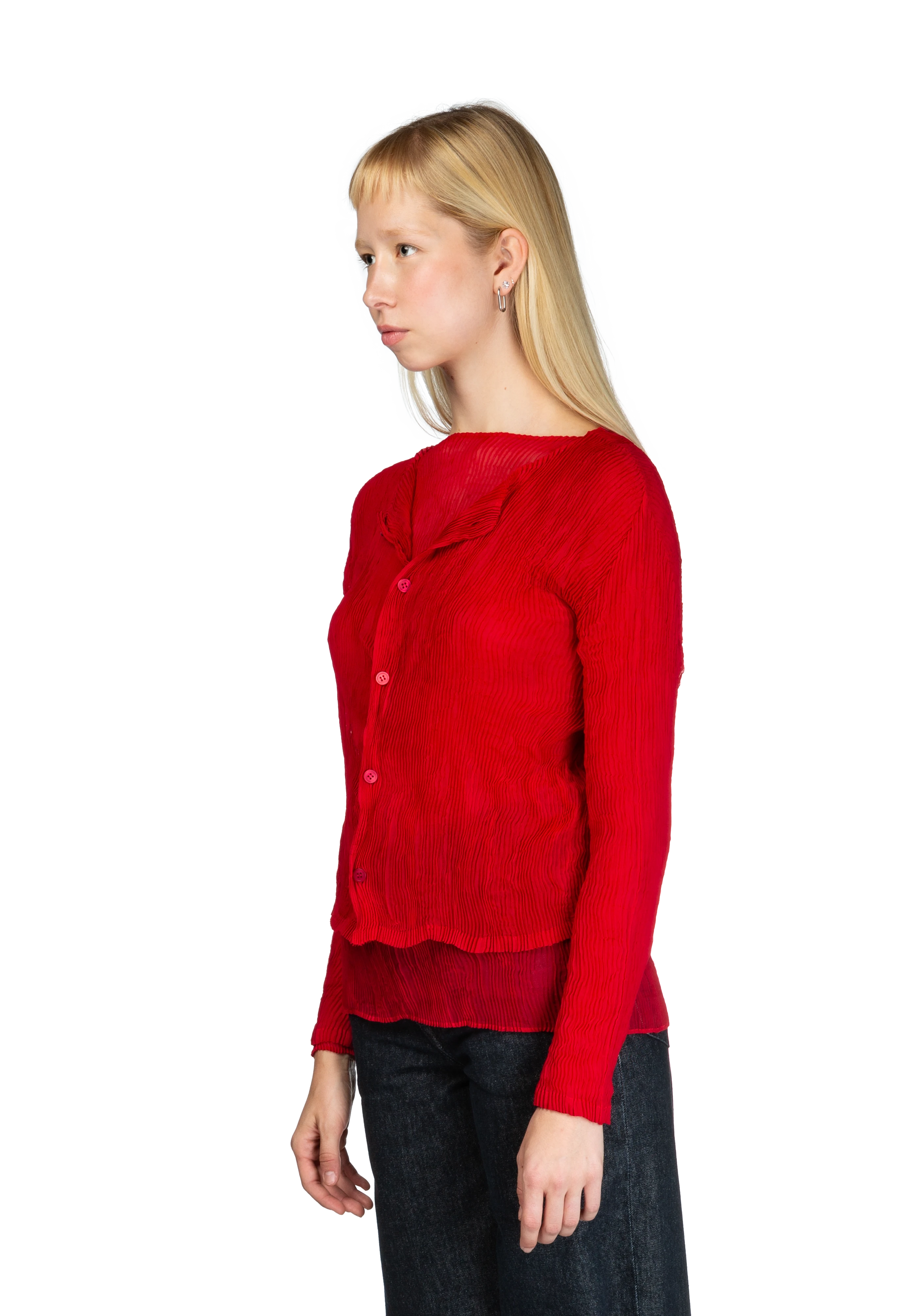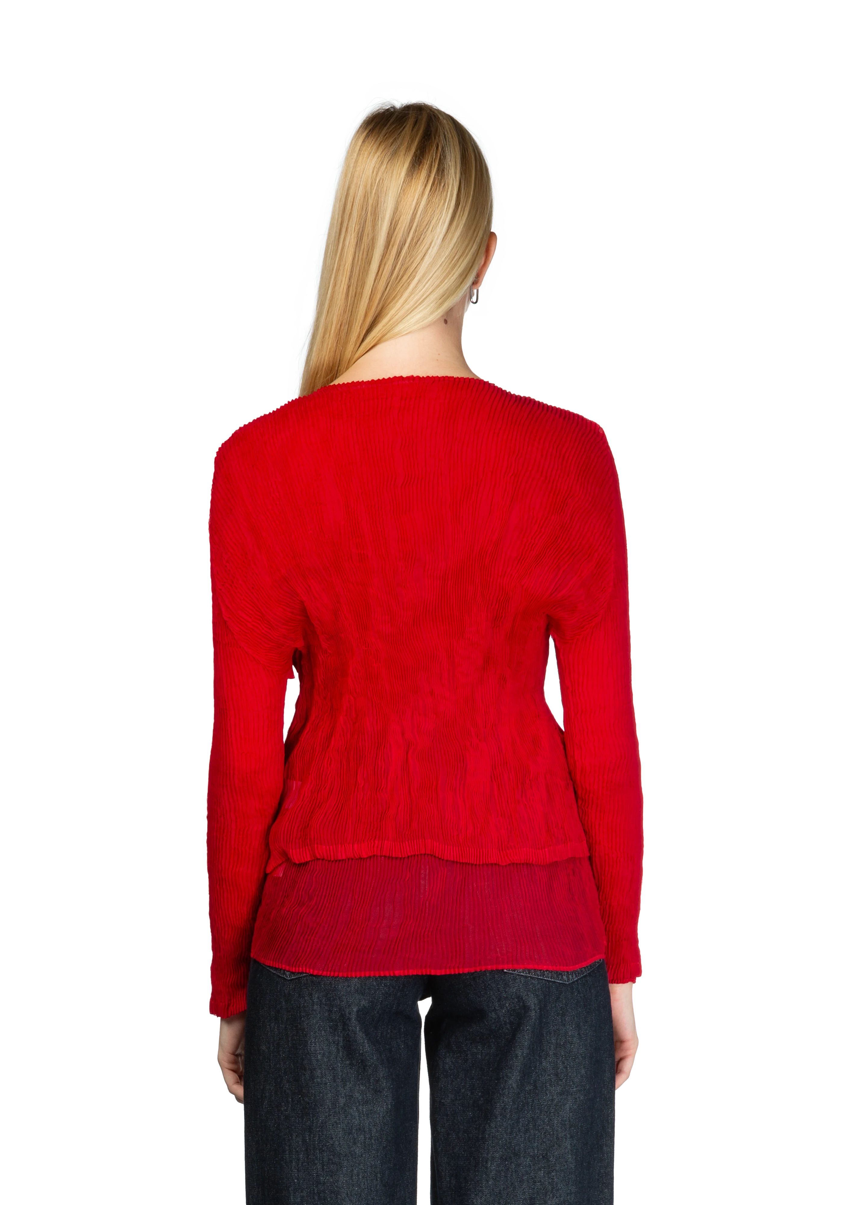 Long-sleeve sheer garment-pleated chiffon cardigan in red.