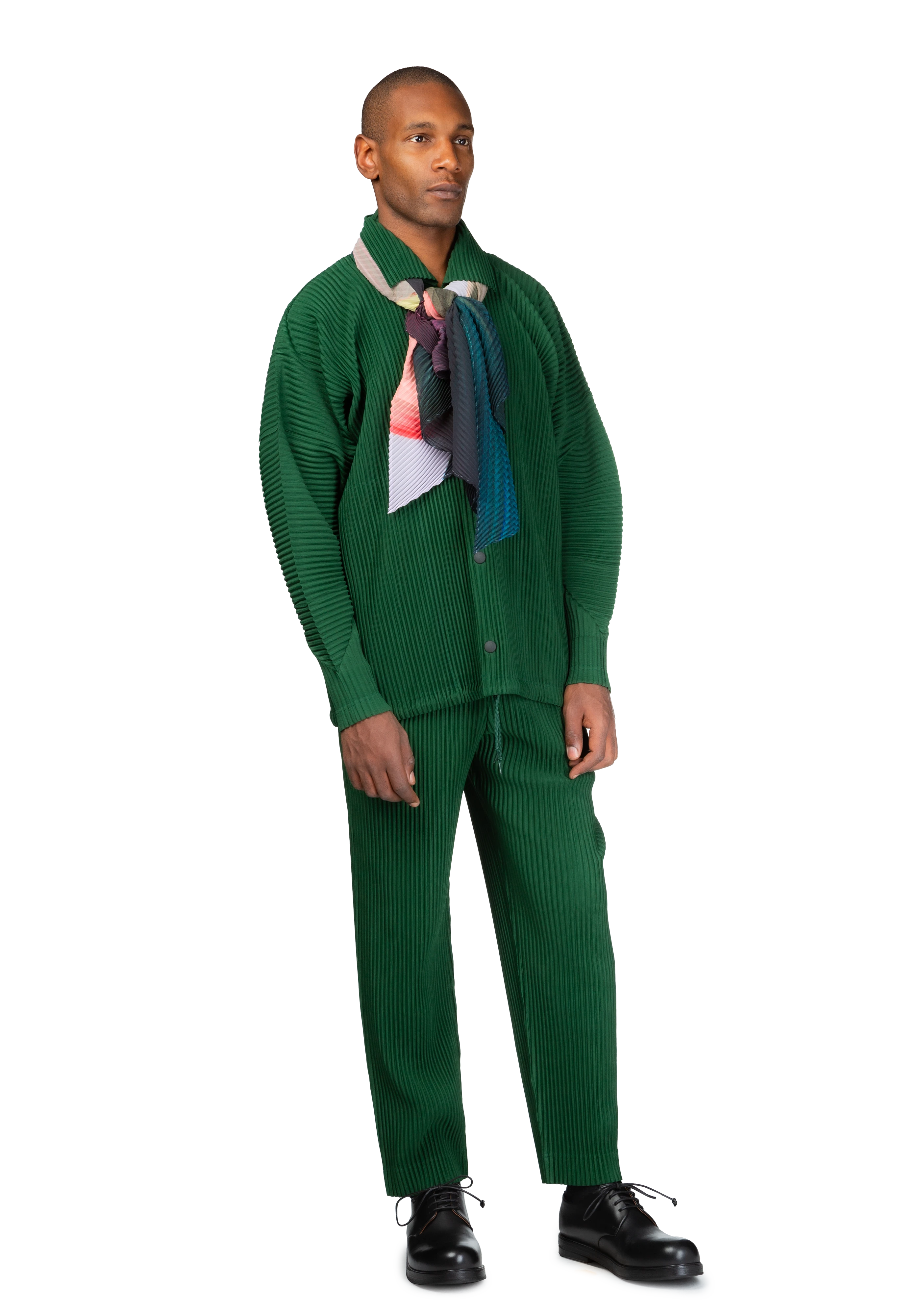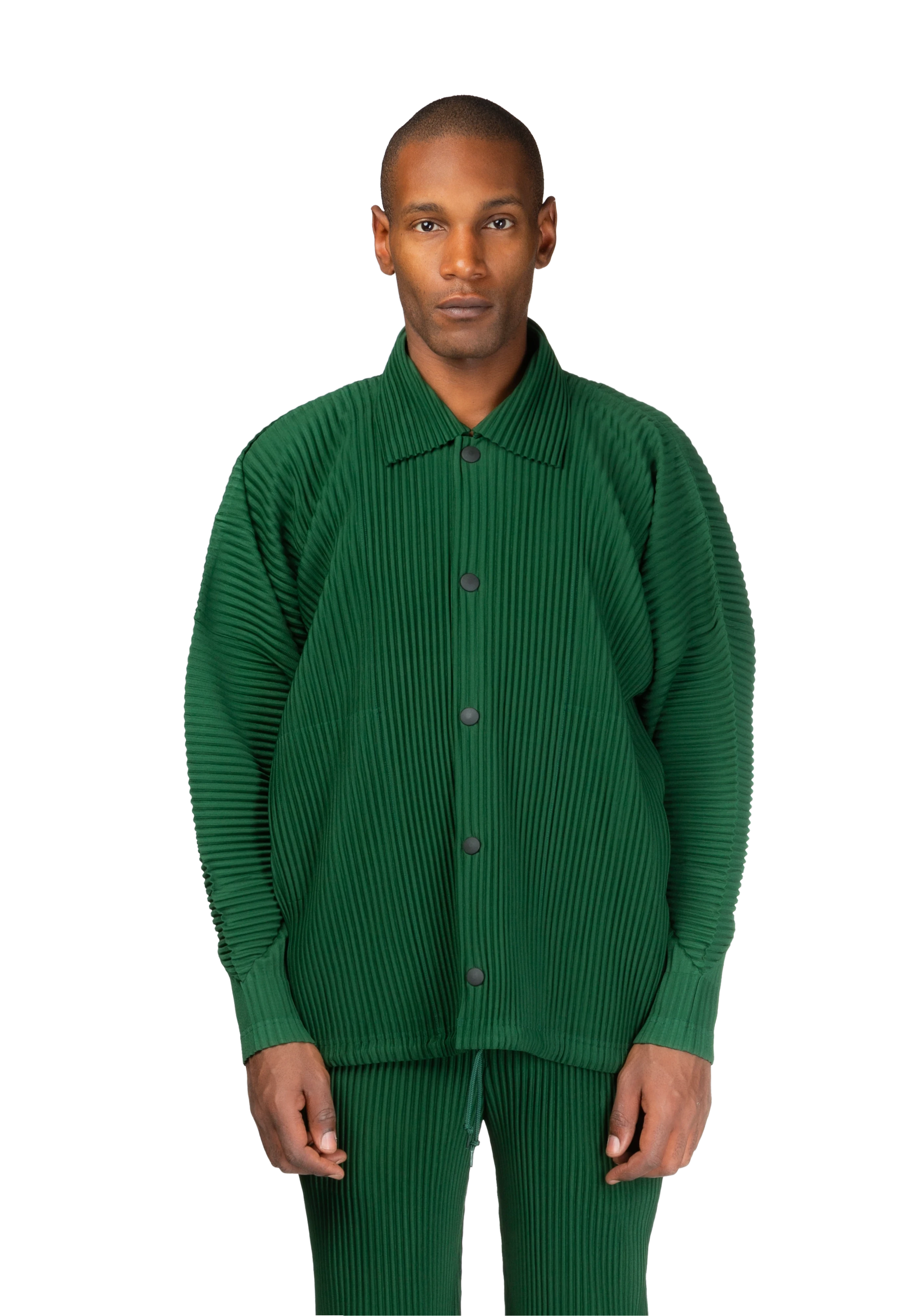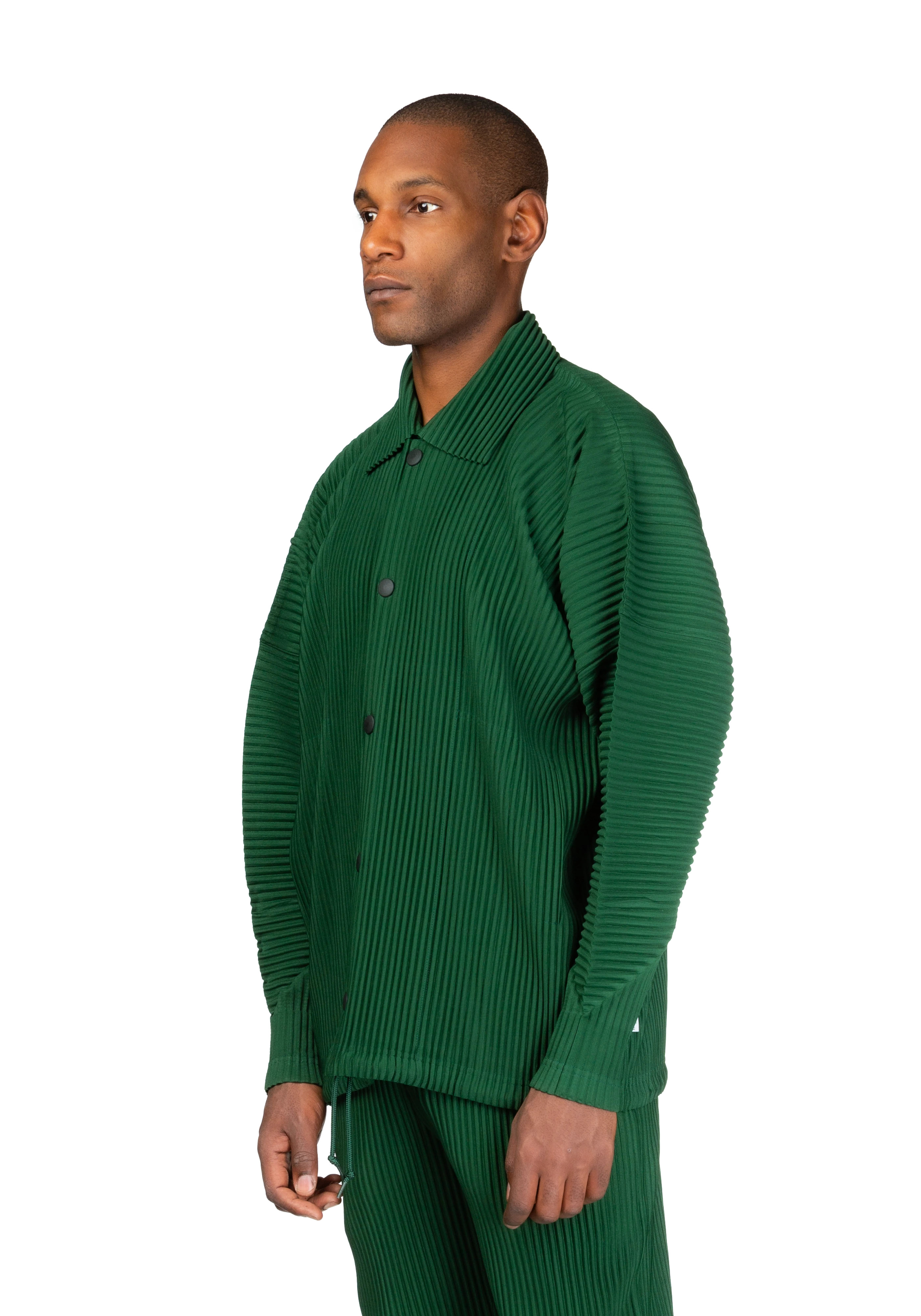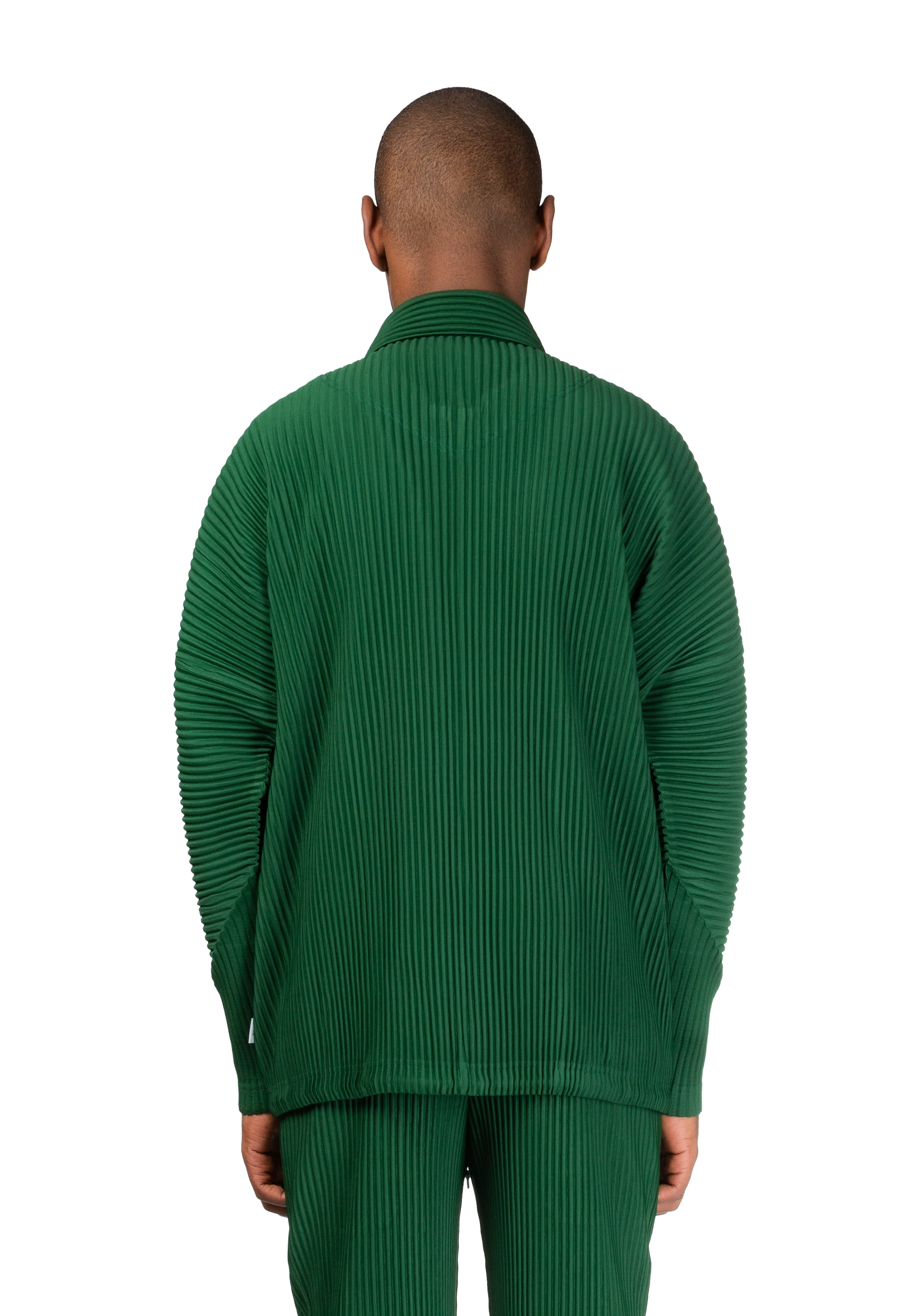 Long-sleeve garment-pleated tricot jacket in seaweed green.