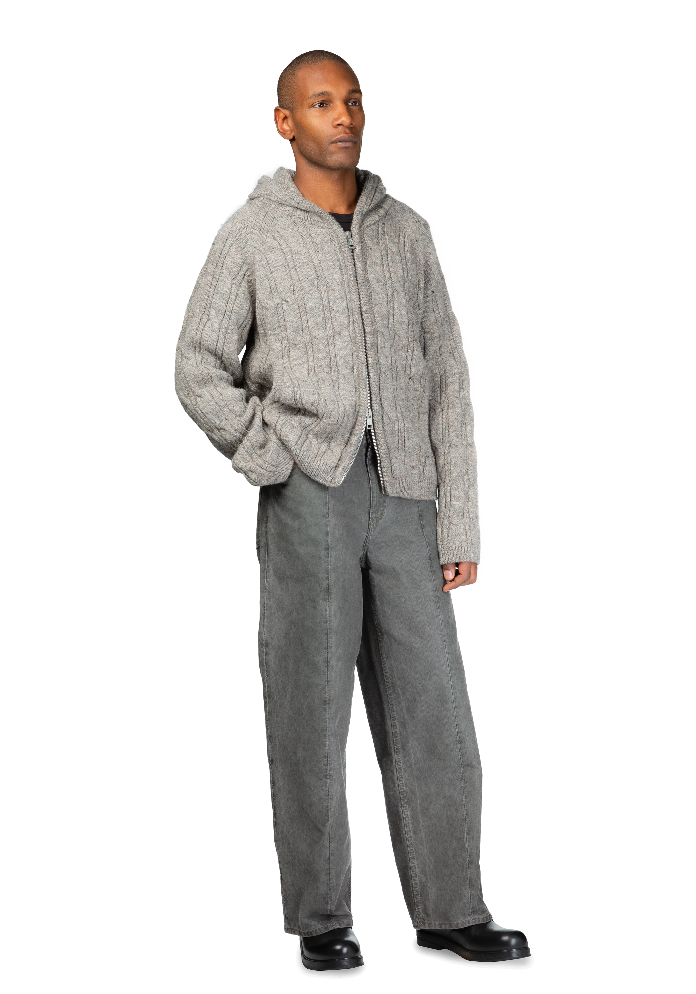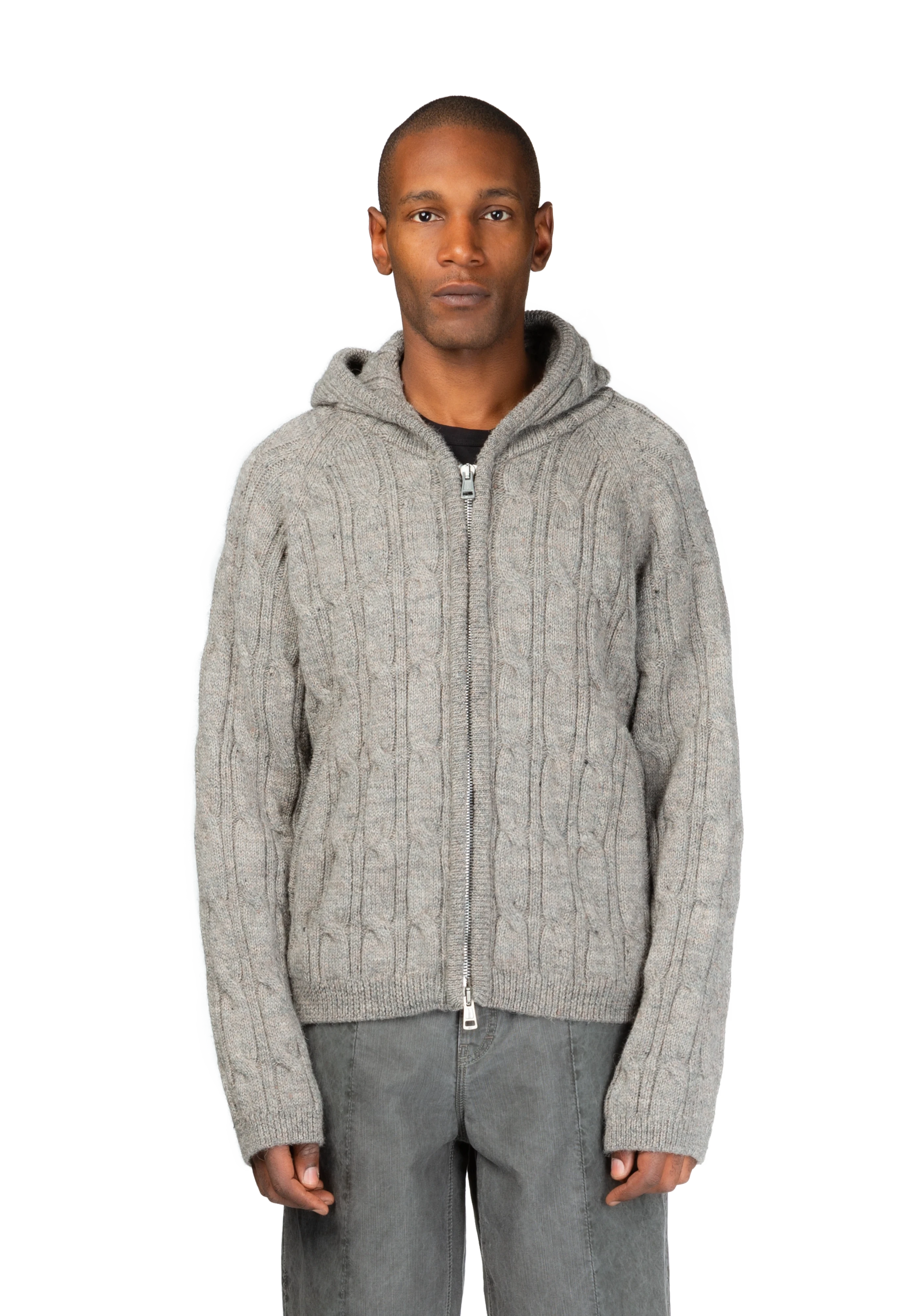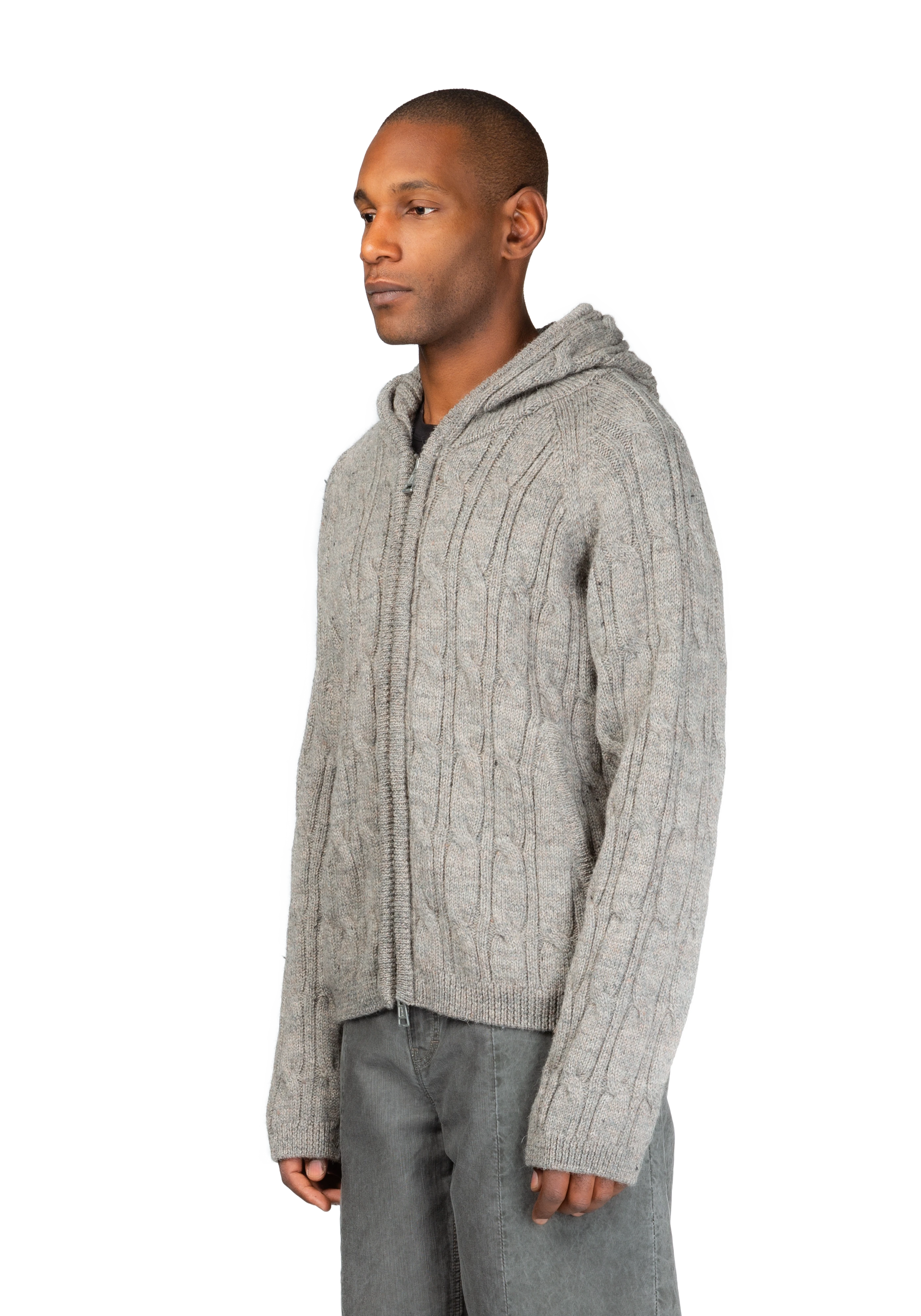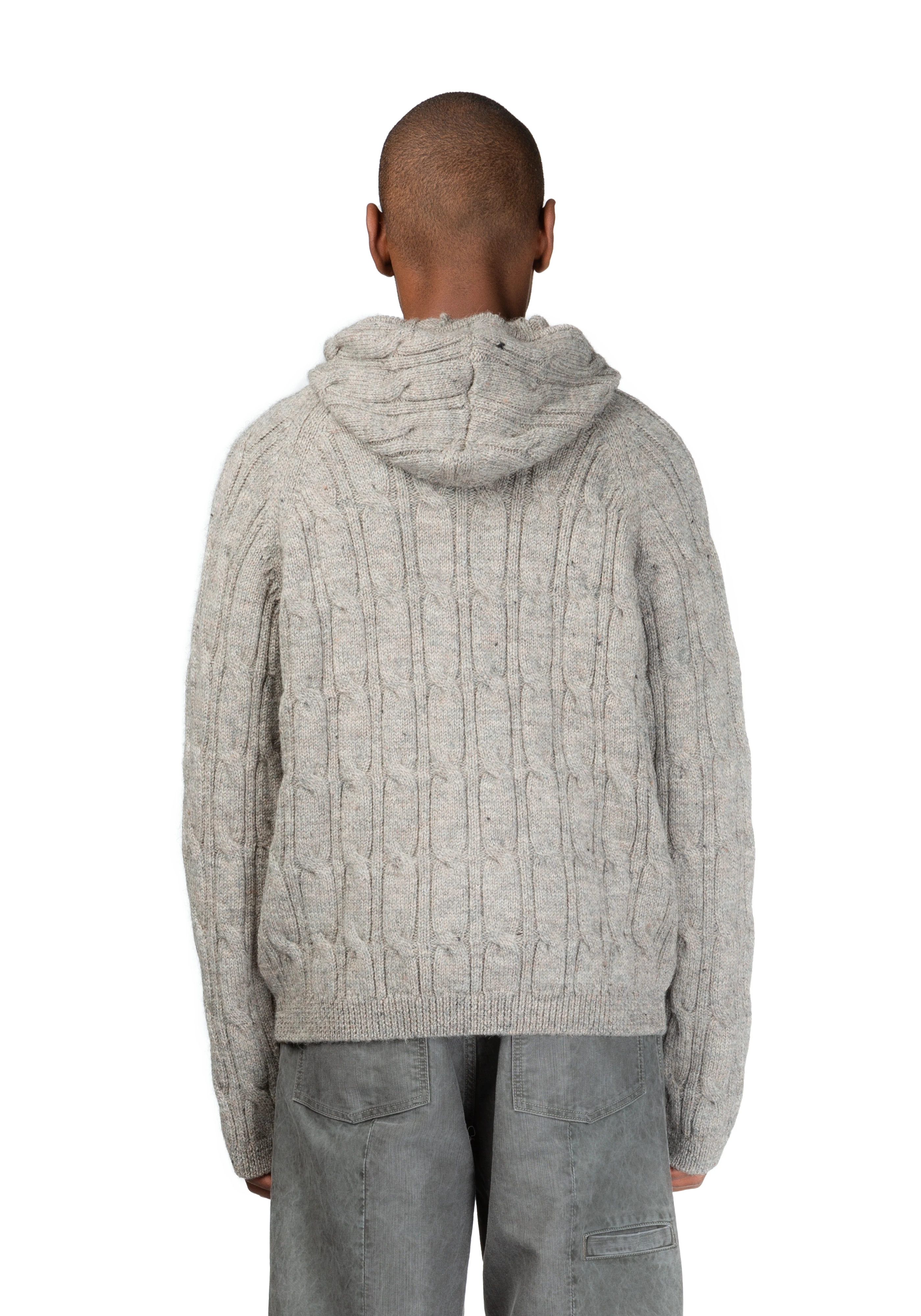 Long-sleeve cable-knit virgin wool hoodie in grey.