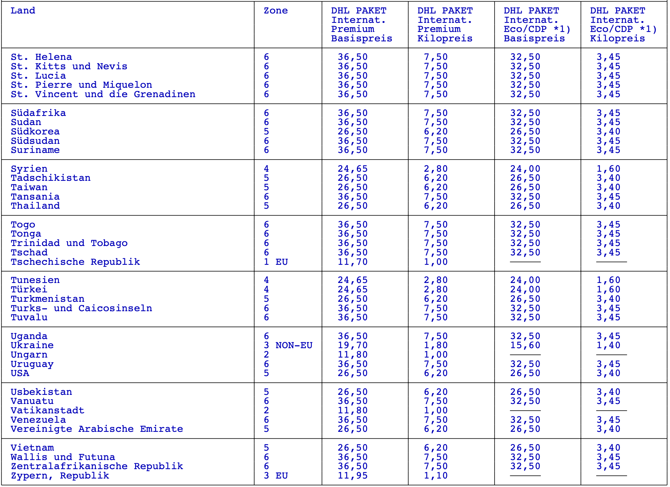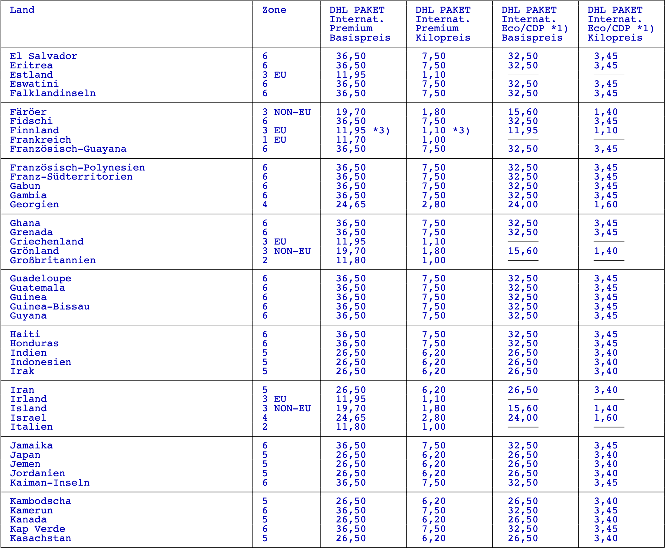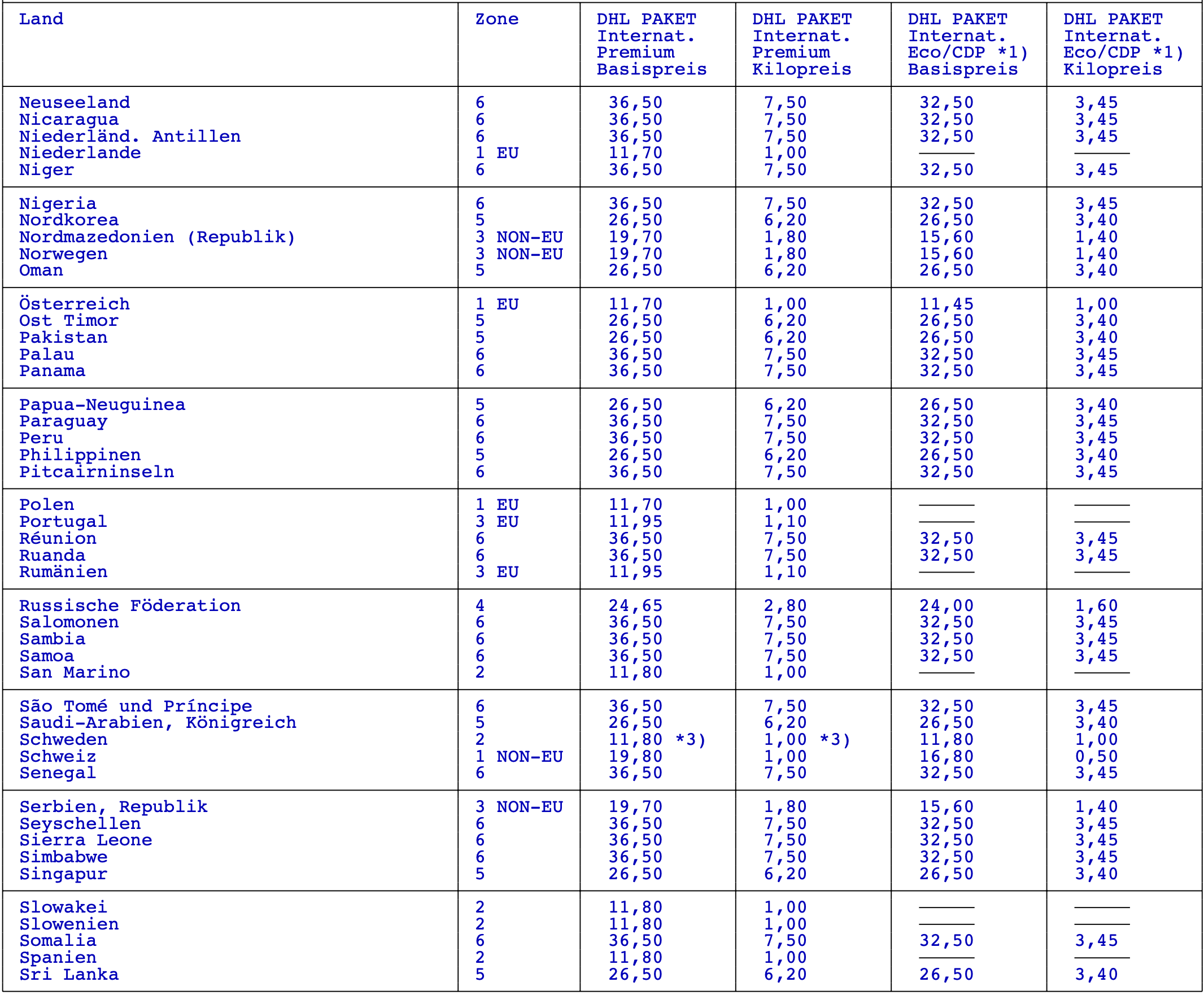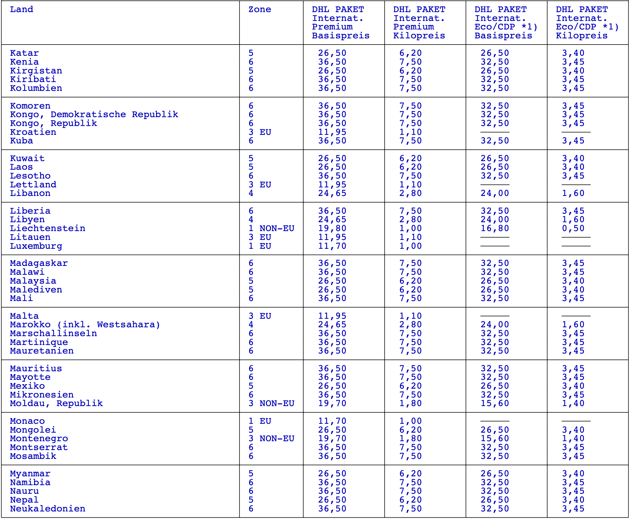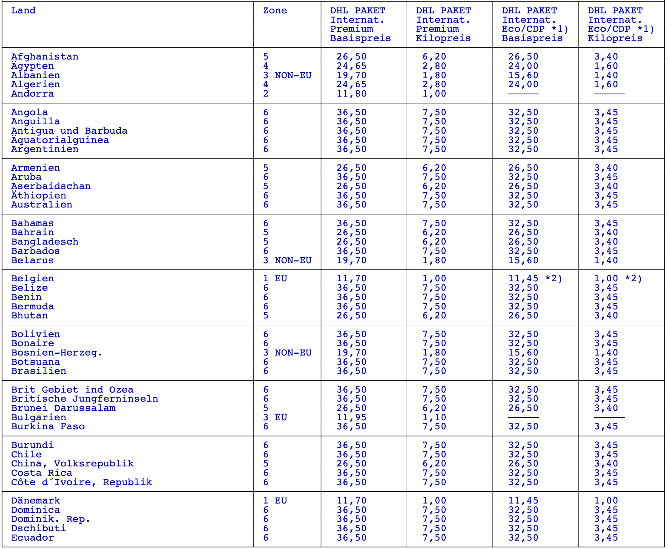 Shipping via DHL Standard or DHL International is at cost price. Our shipping costs are made up of a base price and a kilo price, which differs depending on the delivery country. The delivery countries are distinguished by the six zones of DHL. Below is a detailed list detailing all shipping costs for worldwide delivery.